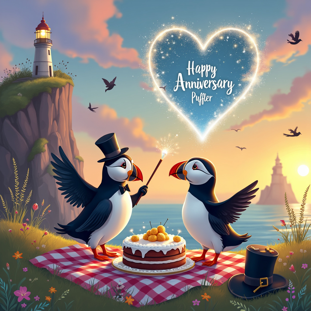 In the sky above them, a constellation of stars has aligned to spell out "Happy Anniversary Puffler" in a whimsical, cursive font. The letters twinkle and shimmer, almost as if they’re made of celestial dust.