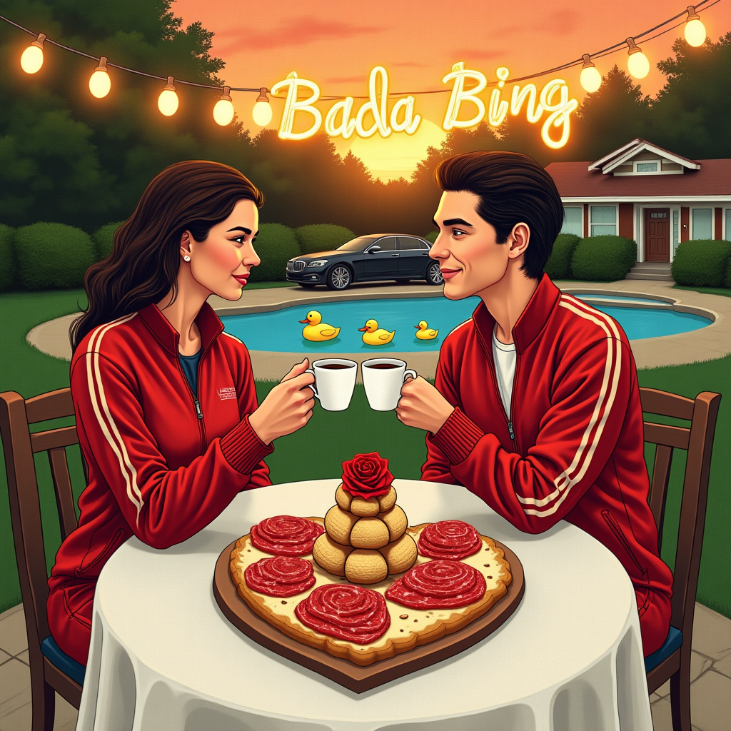 Hand-drawn illustration with fine linework and textured brush strokes in a warm, expressive palette of tomato reds, olive greens, espresso browns, and cannoli-cream whites. A funny Sopranos-inspired suburban New Jersey backyard scene at golden hour: a stylish couple in matching velour tracksuits clink tiny espresso cups over a patio table where deli meats and provolone form a heart, cannoli are stacked like a tiered “cake,” and a salami rose sits in the center. Behind them, a serene pool with a trio of ducks gliding by (a cheeky nod) and a shiny black sedan peeking from the driveway. Twinkly string lights spell out a playful neon-style pun, “Bada Bling,” and a subtle turnpike sign silhouette and pinky rings add winks to the theme. Composition is balanced and image-first: the couple and heart-shaped antipasti are large and central, with warm sunlight and soft paper texture. Add a small, handwritten ribbon near the bottom with one cheeky line: “You’re the gabagool to my provolone.”