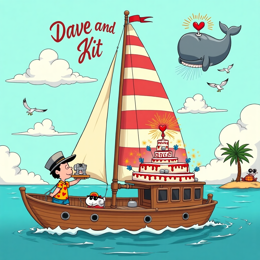 On the deck, Dave, in a Hawaiian shirt, holds an oversized pair of binoculars, looking out towards a tiny, playful whale splashing a heart-shaped fountain of water into the air, inspired by Gary Larson's surreal humor. Kit, dressed in a sailor's cap and an oversized life vest, balances a tray with a massive, multi-tiered anniversary cake topped with sparklers that sizzle like a mini firework show. The cake has "Happy Anniversary" scrawled in icing, with "Dave and Kit" cleverly incorporated as sugar-coated, edible figurines dancing on the cake's surface.