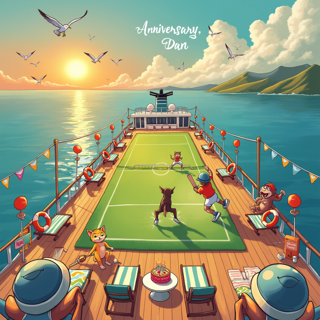 Imagine a vibrant and bustling cricket pitch located on the deck of a luxurious cruise ship, cutting through a picturesque ocean. The ship is decorated with festive streamers and balloons. The cricket field's boundary lines are marked by colorful life preservers and beach towels.