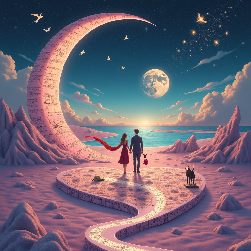 Romantic anniversary, dreamlike surrealism (Dali-inspired): A lavender desert melts into a blush-pink sea under a midnight-teal sky; a crescent-shaped acoustic guitar arches like a moon across the horizon, its silver strings drooping into puddles of time where soft, melting heart-shaped clocks drip and pool. Center stage floats a heart-shaped platform mosaicked from vinyl records and Polaroids; on it, two lovers hold hands, their silhouettes woven from glowing sheet-music notes. A long red scarf spirals around them, unfurling into comet tails. Above, a mirrorball moon scatters pearlescent stardust; a constellation twinkles as the number 13. Flocks of swift birds trace musical staves, while pastel pillars of braided friendship bracelets rise like surreal archways. A galaxy-eyed cat perches on an amp-shaped rock; a gramophone pours a river of stars that becomes a path of roses. Hints of serpents dissolving into satin ribbons drift in the haze. Colors: rose-gold, blush, mauve, midnight blue; ethereal, pearlescent lighting, soft bloom, dreamy haze, gentle volumetric rays. Ultra-detailed yet painterly with melting edges; romantic, tender mood. Vertical composition, 4:5, generous upper-sky negative space, soft vignette, subtle film grain, shallow depth of field with heart-shaped bokeh.