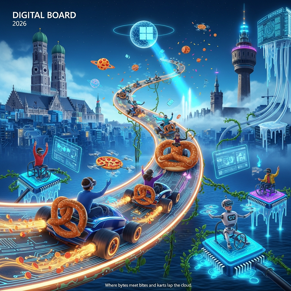 Dreamlike, Dali-inspired surreal cityscape in a blueish futuristic palette (electric cobalt, cyan glows, indigo shadows). Left skyline: Munich’s Liebfrauenkirche (Frauenkirche with twin green onion-domed towers) rising from a sea of shimmering circuit boards. Right skyline: Mannheim’s historic Water Tower (Wasserturm) crowned by ethereal mist and neon fountains. Between them arcs a colossal glowing pretzel-shaped racetrack made of fiber-optic strands and PCB traces, hosting a playful karting race: sleek karts that look like glossy computer mice, wheels made of spinning pretzels, exhausts streaming pizza-cheese neon. A diverse, stylized digital company team (humans and friendly robots) zips along and cheers from floating microchip platforms; many wear virtual reality headsets, piloting via exaggerated hand-gestures. Drones deliver steaming pizzas; pepperoni planets orbit; binary confetti rains. Above, an AI presence: a translucent circuit-brain moon and a halo of flowing neural nets. A subtle nod to Microsoft glows in the sky as a floating four-pane window of light casting azure beams across the scene. Melting server-clocks drape from fiber clouds; holographic dashboards and chat panes float quietly (no text), cable-vines curl like vines. Ethereal volumetric lighting, soft bloom and reflections across a mirror-like data-lake; playful, funny, celebratory, high detail, blueish futuristic style.
