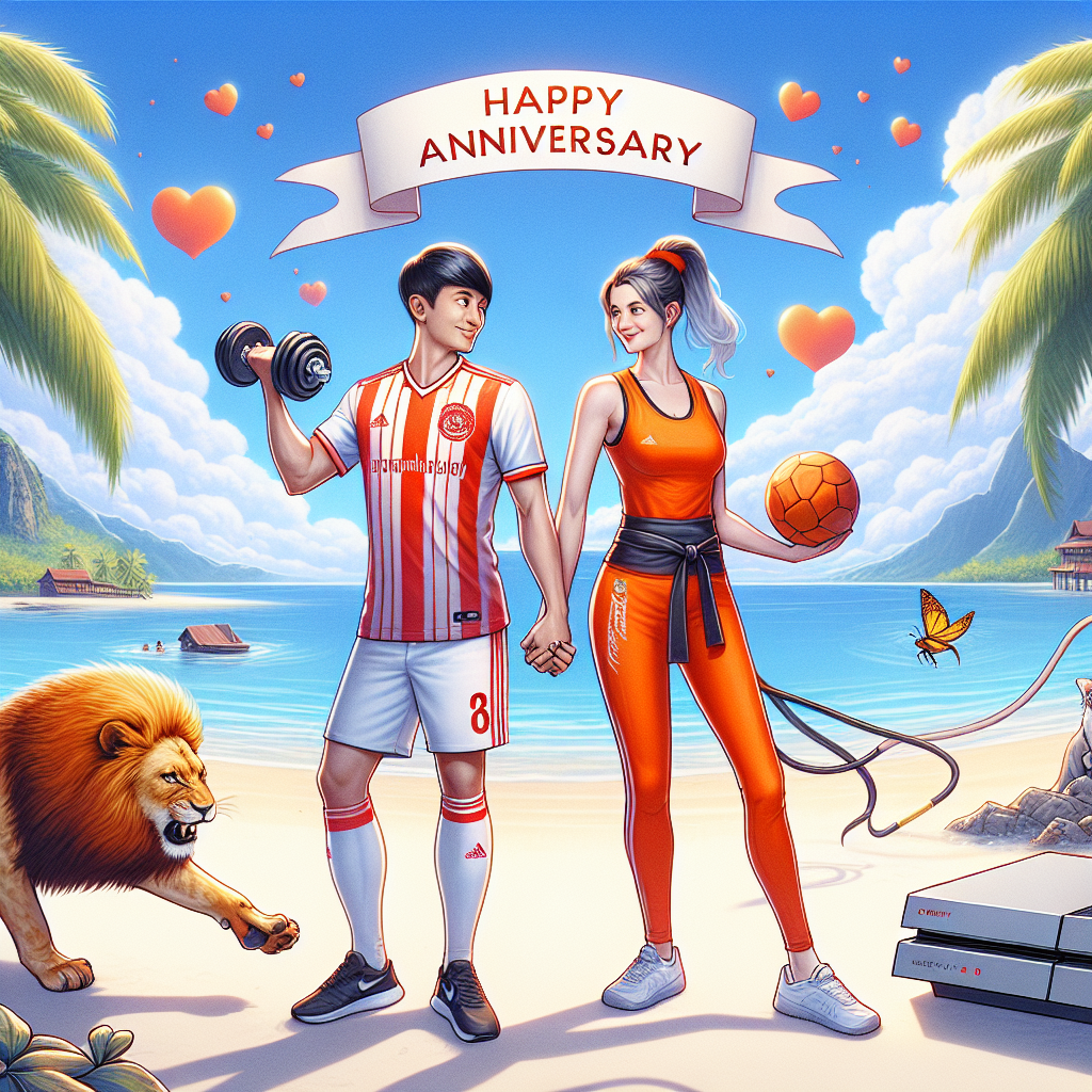Create a whimsical illustration for an anniversary. The image is dominated by a couple in the center, one partner is dressed in a red and white jersey, modelled after a popular English football club, while the other is in a bright orange martial arts outfit, reminiscent of a popular anime. They're jointly lifting a dumbbell, symbolizing their shared passion for fitness. In the background, a scenic beach with palm trees and clear blue skies creates a romantic mood. A lion is playfully roaming nearby, and a gaming console resembling a current popular model is subtly integrated into the scene. Above them, 'Happy Anniversary' is written, with the date '3rd June 2017' encircling the couple. Completing the image are floating hearts and the word 'Love' adding the finishing touches to this unique celebration of shared activities and passion.