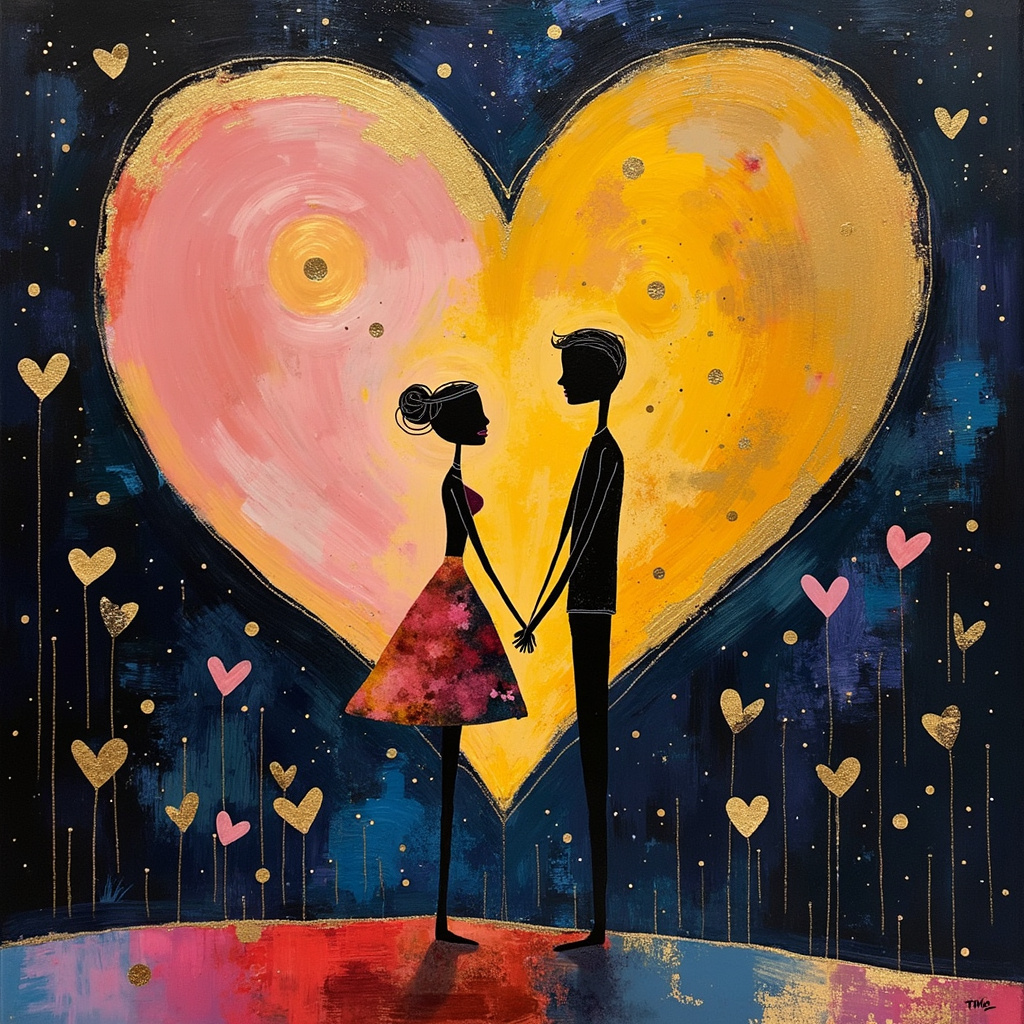 At the center of the scene is a gigantic, radiant, heart-shaped moon that takes cues from Mark Rothko's layering techniques. The heart-moon is textured with swirling shades of pink, gold, and lavender, evoking a sense of depth and warmth. It hovers in a night sky filled with Piet Mondrian-inspired grids of black, blue, yellow, and red, giving a nod to geometric abstraction.
