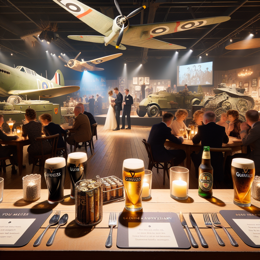 An image of a nostalgic setting, reflecting the atmosphere of the 1950s, with a delightful touch of classic music playing in the background. The scene captures the perfect ambiance for couples celebrating their 10th wedding anniversary. There's a subtle hum of mingling guests, with a selection of Guinness drinks casting an inviting glow. The space interspersed with meticulously crafted displays of WWII German tanks and airplanes, providing an intriguing mix of history and realism to the occasion.