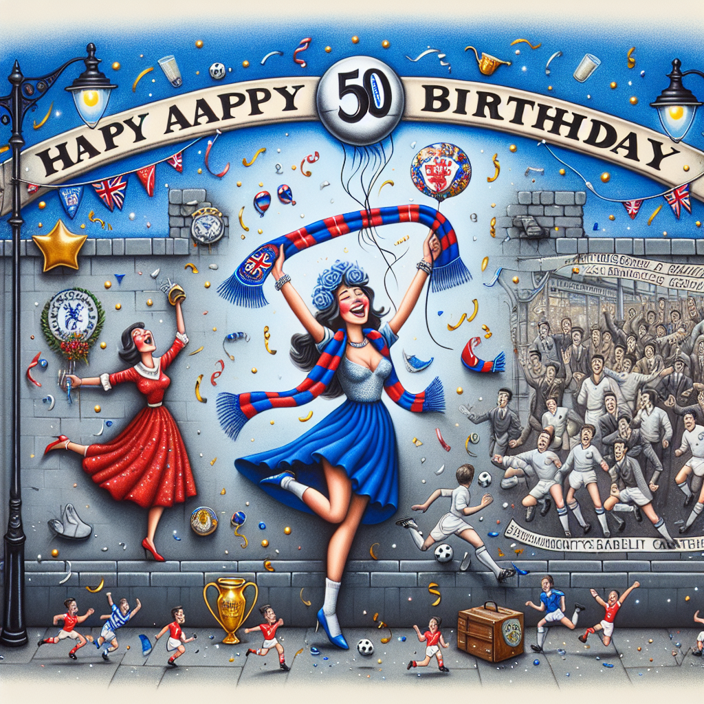 A whimsical illustration commemorating a 50th birthday, focusing on a joyous Caucasian female fan of a popular London-based football club, celebrating enthusiastically. She's dressed in the club's traditional hues, proudly raising a scarf in the air. A playful adaptation of a popular 19th-century style street art mural, known to feature a girl with a balloon, is incorporated, but the balloon is replaced with a football. Glistening confetti whirls around the setting, while miniature interpretations of anonymous footballers frolic along the bottom, turning the overall scenery into a festive tribute to both the sport and the antique art form.