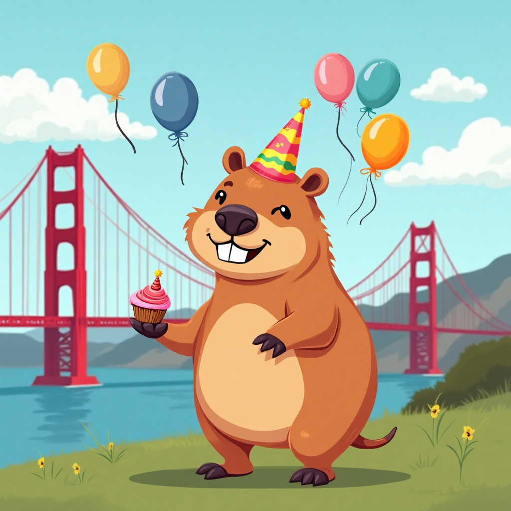In a whimsical and colorful vector style, imagine a cute and jovial capybara standing proudly in the foreground. This capybara is wearing a tiny party hat that slightly tilts to one side, adding to its charm. It's playfully winking with a broad smile, holding a small, festive birthday cupcake in its paw. In the background, majestically spanning across the scene, is the iconic Golden Gate Bridge, its rich red color contrasting against a bright blue sky dotted with fluffy white clouds. To enhance the birthday cheer, scattered around the capybara are colorful balloons gently floating upwards. The overall mood is lighthearted and fun, perfect for celebrating a special day with a touch of humor and capybara cuteness.