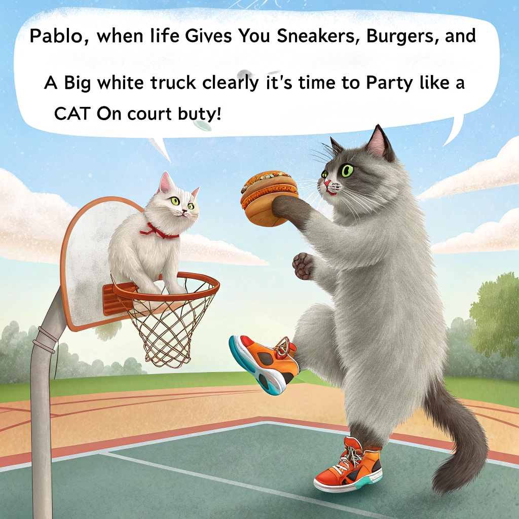 At the top of the realistic photograph image, "Pablo, when life gives you sneakers, burgers, and a big white truck—clearly it’s time to party like a cat on court duty!"