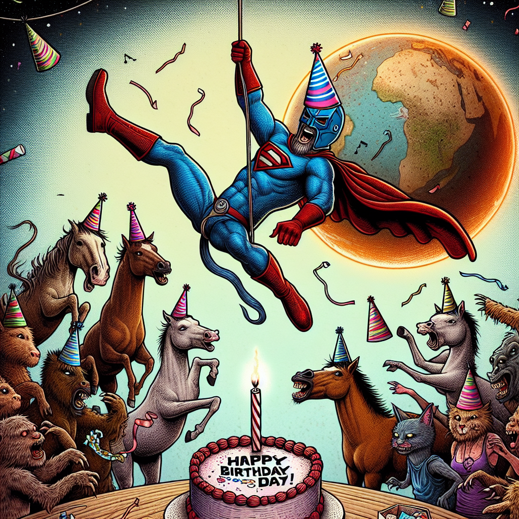 A whimsical birthday illustration depicts Spider-Man hanging upside down from his web, donning a party hat, as he swings over a comically apocalyptic 'The Waking Dead' themed party. Horses and cats, both in festive attire, are seen dancing to Nirvana's greatest hits, with one cat dramatically lip-syncing with a toy microphone. A birthday cake in the center shows a mix of these elements, combining superhero antics with rock and roll and the living dead.