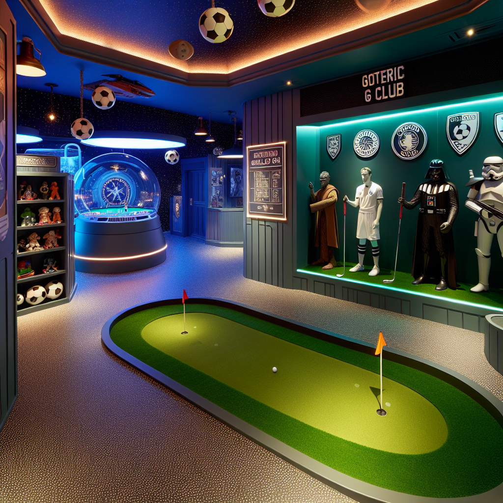 The room exhibits a charming and vibrant atmosphere, echoing the spirit of celebration for a birthday occasion. It seamlessly integrates football club mementos without specifying a particular club. A corner is carved out for a futuristic sci-fi-themed putting green, inviting guests to participate in mini-golf sessions. Lifelike cutouts of generic galactic heroes and villains guide guests along an immersive narrative path that weaves its way throughout the room.