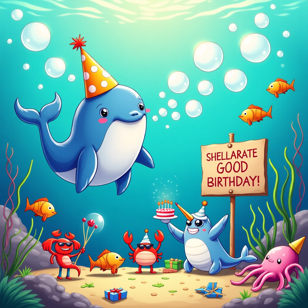 Underwater-themed funny birthday illustration featuring a cheerful party scene beneath the sea: A big, goofy-looking whale wearing a polka-dotted party hat is blowing bubbles shaped like balloons, while a grumpy crab in sunglasses serves cake made of seaweed. Nearby, a school of fish conga lines past a sign that reads "Shellabrate Good Times!" in coral letters. Jellyfish wear party glasses, a narwhal tries to pop bubble-balloons with its horn, and an octopus juggles presents with eight arms. The ocean floor is littered with discarded gift wrap and party streamers made of sea kelp. Everything has a light-hearted, whimsical cartoon style with vibrant colors and silly facial expressions.