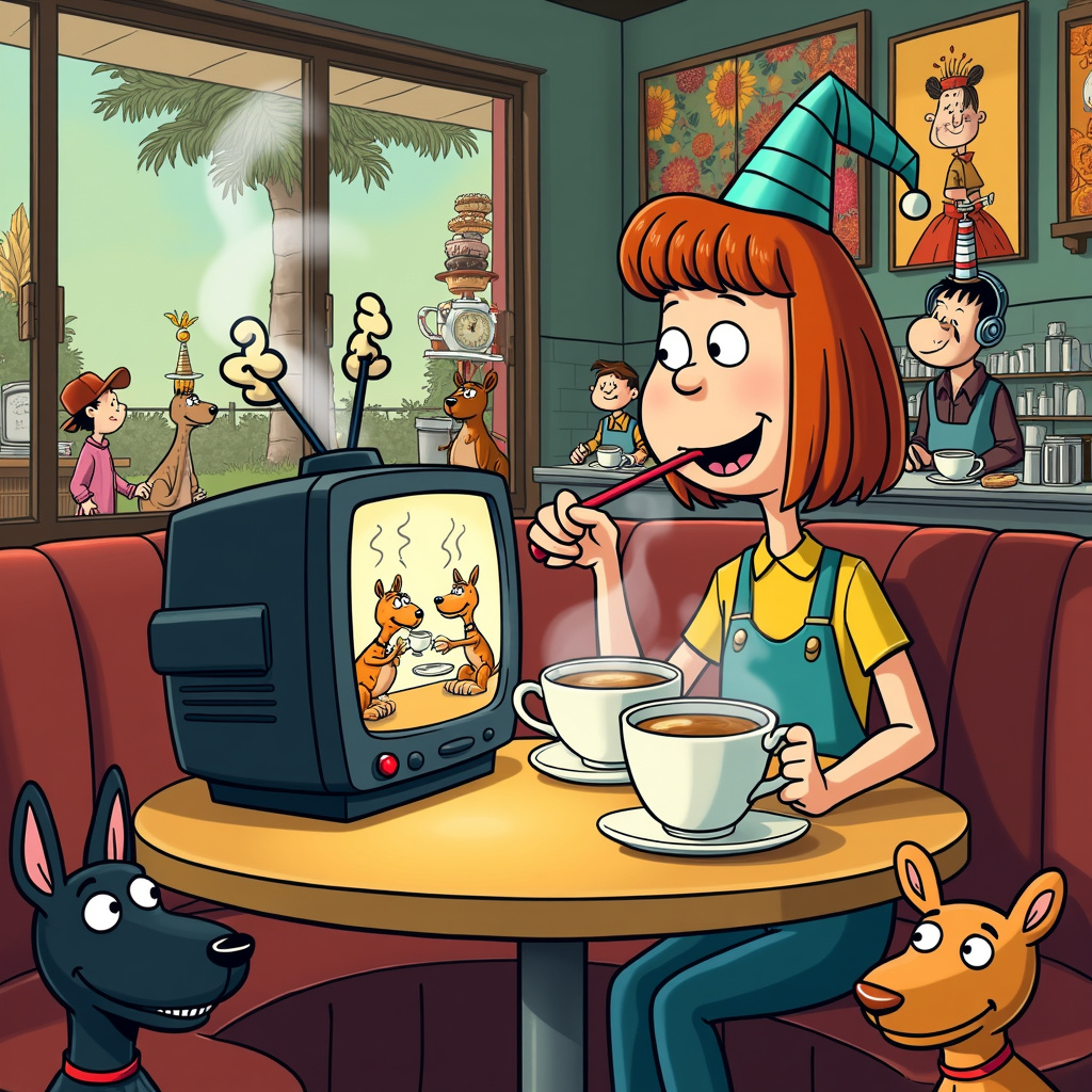 In the foreground, a round table is central, laden with steaming, frothy lattes served in oversized, quirky mugs that look like they have faces, each expressing a different emotion—happy, sleepy, surprised. Sitting at the table, we find Pauline, a lively character with exaggerated, expressive features akin to those in "Calvin and Hobbes." Pauline is joyfully sipping her latte through a comically large straw while her eyes are glued to a miniature flat-screen TV placed on the table, showing a dramatic moment from a fictional reality TV show, something exaggeratedly absurd, like a cooking competition where the chefs are juggling flaming swords.