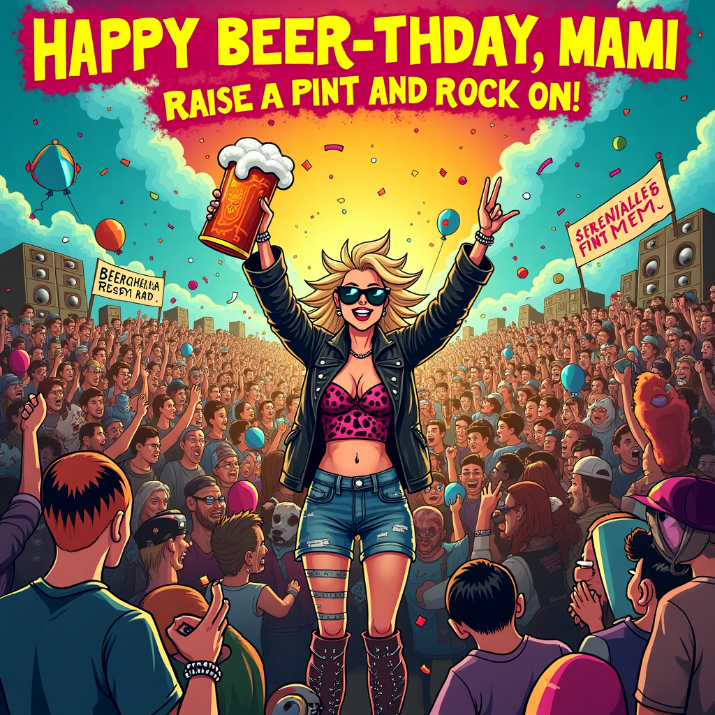 Generated with these themes: PUNK ROCK FESTIVAL WITH LOTS OF BEER, HAPPY BEER-THDAY MAMI, and MANY PEOPLE AND IN THE MIDDLE A BLONDE WOMAN WITH A BEER.