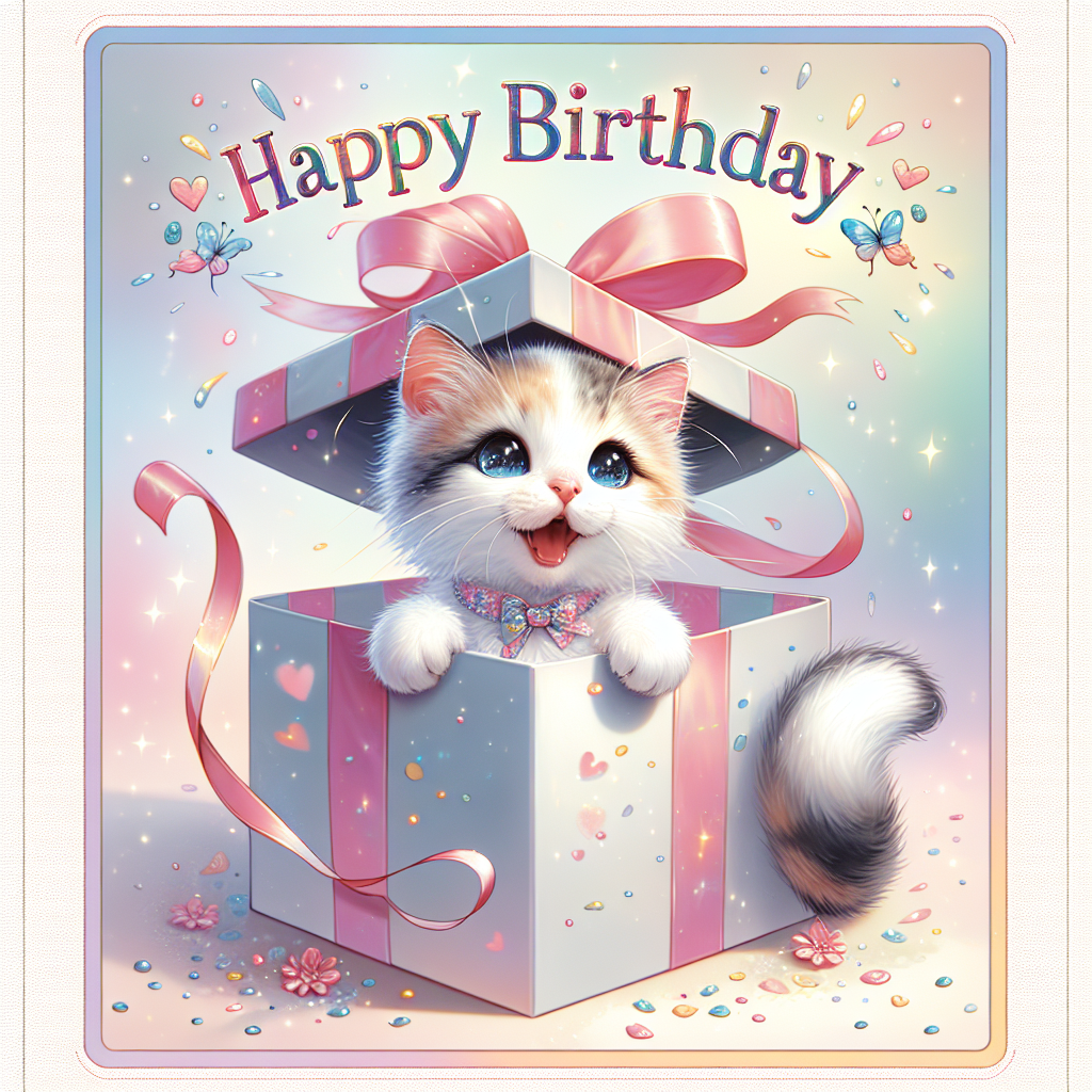 An adorable birthday card showcasing a playful Japanese Bobtail kitten bursting out of a gift box with a ribbon tied around its neck. The background is a burst of pastel colors and sparkles, with 'Happy Birthday' inscribed in whimsical, floating letters around the kitten.