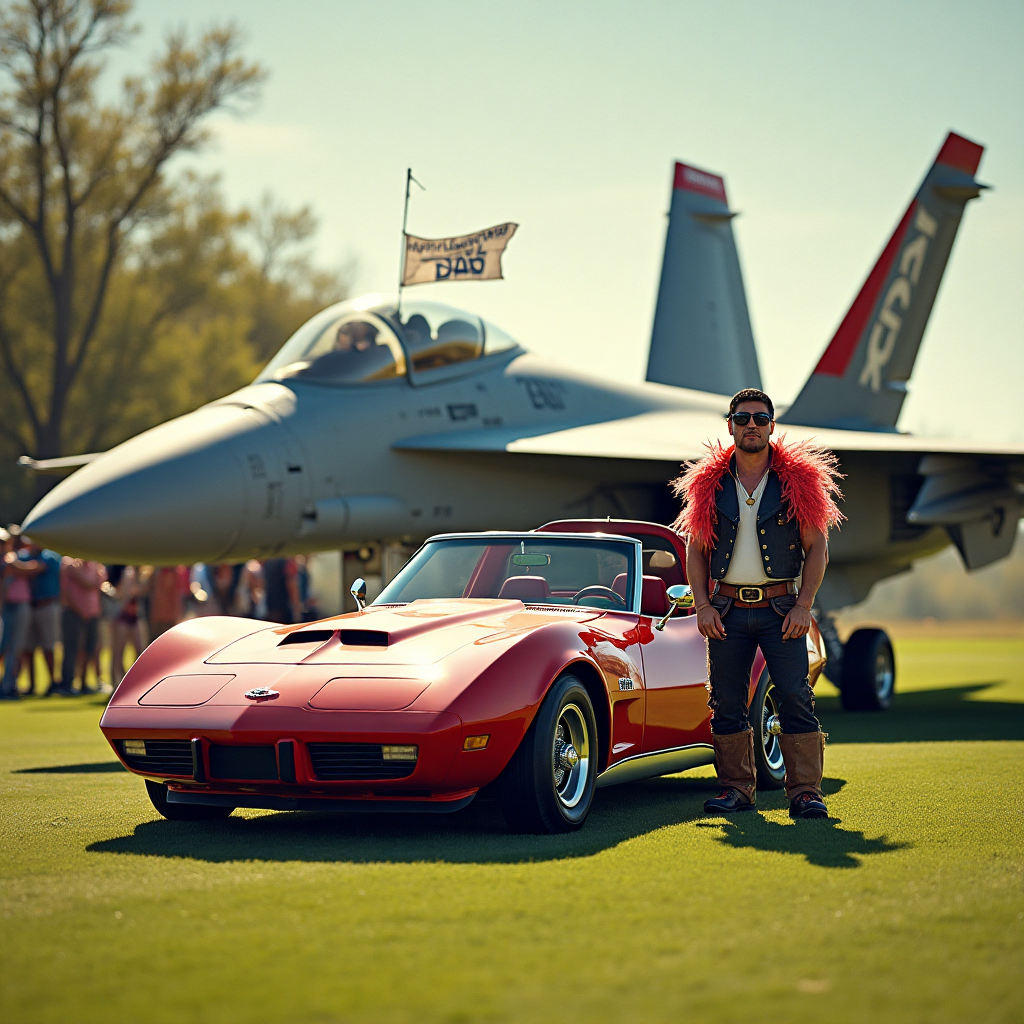 In a thrilling and slightly absurd birthday celebration scene, an F-18 fighter jet is parked casually on a golf course, its nose cone almost touching the tee. Next to it, a sleek corvette race car gleams in the sunlight, parked right on the green. The car's driver, dressed in vintage 1970s rock attire complete with a flamboyant feathered boa and oversized sunglasses, leans casually against the car. An NFL quarterback, in full gear, is lining up to kick a golf ball as if it were a field goal. The background features a group of confused golfers, mouths agape, frozen mid-swing as they witness this surreal ensemble.