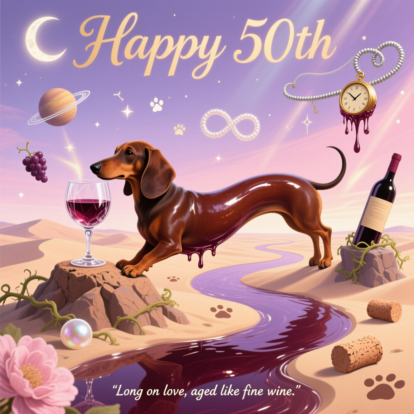 Dali-inspired dreamlike surrealism: a glossy mahogany sausage dog (dachshund) stretches impossibly long, its back melting into a winding river of merlot that snakes through velvet sand dunes. The pup, calm and sincere, delicately sips from an oversized crystal wine glass perched on a warped cork hill. Ethereal, pearlescent light spills across the scene; soft godrays and a rosy bloom glint off the glass and the wine river’s mirror surface. Floating grape planets drift overhead on silver threads; a corkscrew-shaped crescent moon; melting wine-label clocks draped over warm stone outcrops; vine tendrils curl into gentle infinity loops. Subtle celebratory details: two translucent wine rings on the horizon quietly suggest the number 50; faint pawprint constellations shimmer in the distance. Color palette: blush, deep merlot, honey gold, lilac, mother-of-pearl highlights. Texture: painterly brushstrokes with refined detail, glassy reflections, velvety dunes, soft bokeh motes. Composition: full-bleed vertical, rule-of-thirds, the wine river leading in an elegant S-curve toward the glowing horizon. Mood: sincere, tender, quietly celebratory. No people; the dachshund and the glass are the heroes.