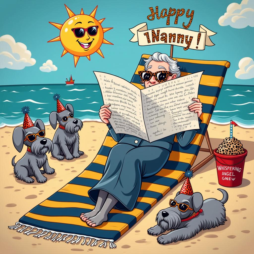A whimsical cartoon beach scene serves as the backdrop for a hilarious birthday scenario where Nanny is the star. The sky is a vibrant blue with a smiling sun wearing leopard print sunglasses. The sand below is dotted with gray mini schnauzers in party hats, each carrying a tiny beach pail with the 'Whispering Angel' wine label. In the center, Nanny lounges on a bold wren navy-striped beach towel, engrossed in a massive crossword puzzle that, upon closer inspection, is filled with well-wishes and birthday greetings. A large, comical birthday cake to her side is adorned with a banner that exuberantly proclaims 'Happy Birthday Nanny!', with each letter in a pattern of leopard prints and heels on bags. A pair of fashionable heels is playfully used to anchor the towel corners against the beach breeze.