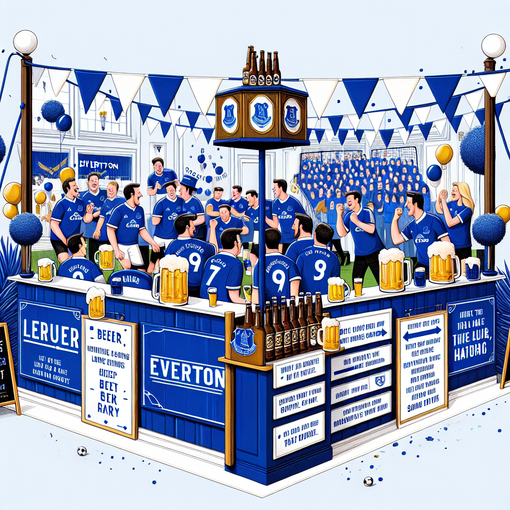 Illustrate a lively scene of a football-themed birthday party with decorations predominantly in royal blue and white, reflecting the Everton team's colors. There's a festive atmosphere echoed by the laughter, cheers, and a curated upbeat music playlist playing in the background. The party features a playful 'stadium' set up for beer relay races, with guests divided into teams, all dressed in Everton jerseys. A unique corner bar, designed to resemble a goalpost, is a high point, serving guests personalized mugs of beer and suggesting types of ale based on their individual music preferences, encapsulating the synchrony of music and love for beer.