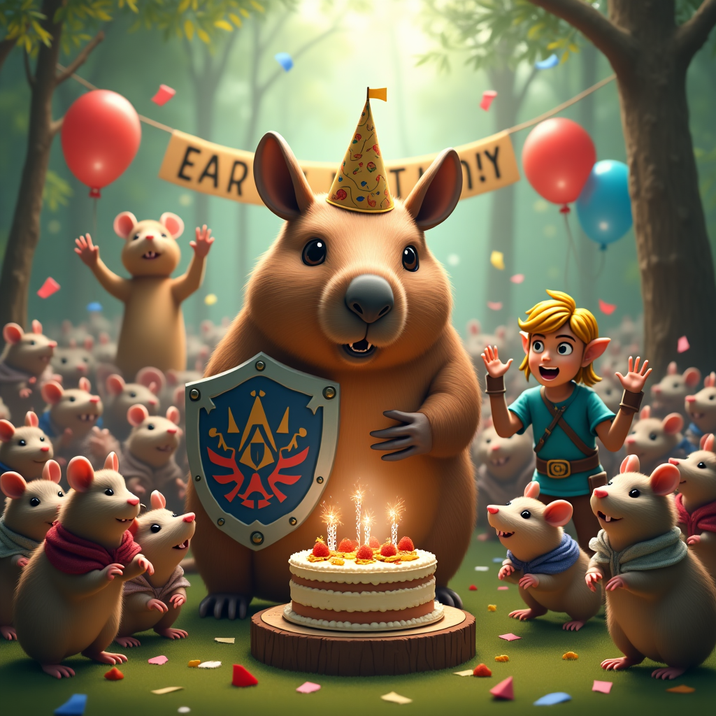 Realistic photograph prompt: A whimsically chaotic birthday scene in a forest clearing lit with dappled sunlight. In the center, a massive, majestic capybara wears a Hylian shield strapped to its side and a paper party hat atop its head. It's surrounded by an excited horde of well-dressed party rats, each in Renaissance-era garb, tossing confetti and munching on tiny slices of cake. A cardboard cutout of Sans from Undertale photobombs from behind a tree, throwing up jazz hands. Link (from Zelda), looking mildly confused, is offering a present wrapped in rat-patterned paper to the capybara. Balloons spell out “LVL 16” above the crowd, and a banner in the background reads “You’ve met with a wonderful fate, haven’t you?” A realistic woodland cake topped with sparklers smokes gently on a rustic table made of logs. Everything is photorealistic with exaggerated but believable facial expressions on the animals.