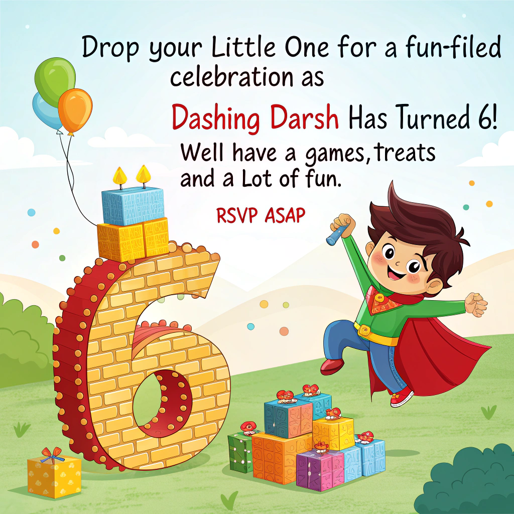 In the center, depict a bright, playful cartoon scene inspired by toy bricks: Dashing Darsh as a chibi, minifigure-style superhero kid with a bold red cape and mega-grin, hero-posing atop a giant number 6 built from colorful interlocking bricks. Around him, goofy brick-built balloons, a wobbly brick birthday cake with flickering candles, and excited cartoon kids in party hats racing and building silly brick contraptions. Add confetti blizzards, streamers, and a rainbow brick arch overhead. Exaggerated proportions, thick black outlines, and high-saturation primary colors; energetic poses, motion swooshes, and sparkles. Clean, legible text areas in chunky, blocky lettering, with soft cel shading and bouncy, cheerful lighting.