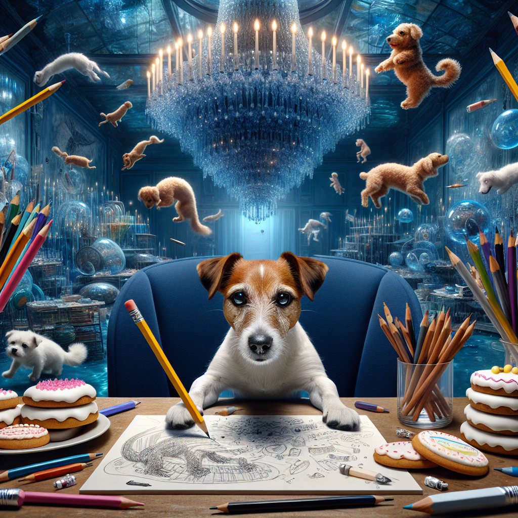 Imagine a surreal yet realistic birthday setting that brilliantly combines elements of everyday life with an artistic touch. In the center of the scene, there is a Jack Russell Terrier focused intently on a drawing table. A variety of pens surround the dog, and strangely, they appear to be sketching different birthday-related themes on the existing canvas on their own. Taking spectator's attention away from the pencils' strange behavior, a large, opulent blue glass chandelier hangs from the ceiling. The light that it refracts imbues the entire room with a soothing, undersea quality. Amidst the whirlwind of drawing activity, a plate of Lebkuchen cookies adorably designed to look like little birthday cakes are poised for consumption.