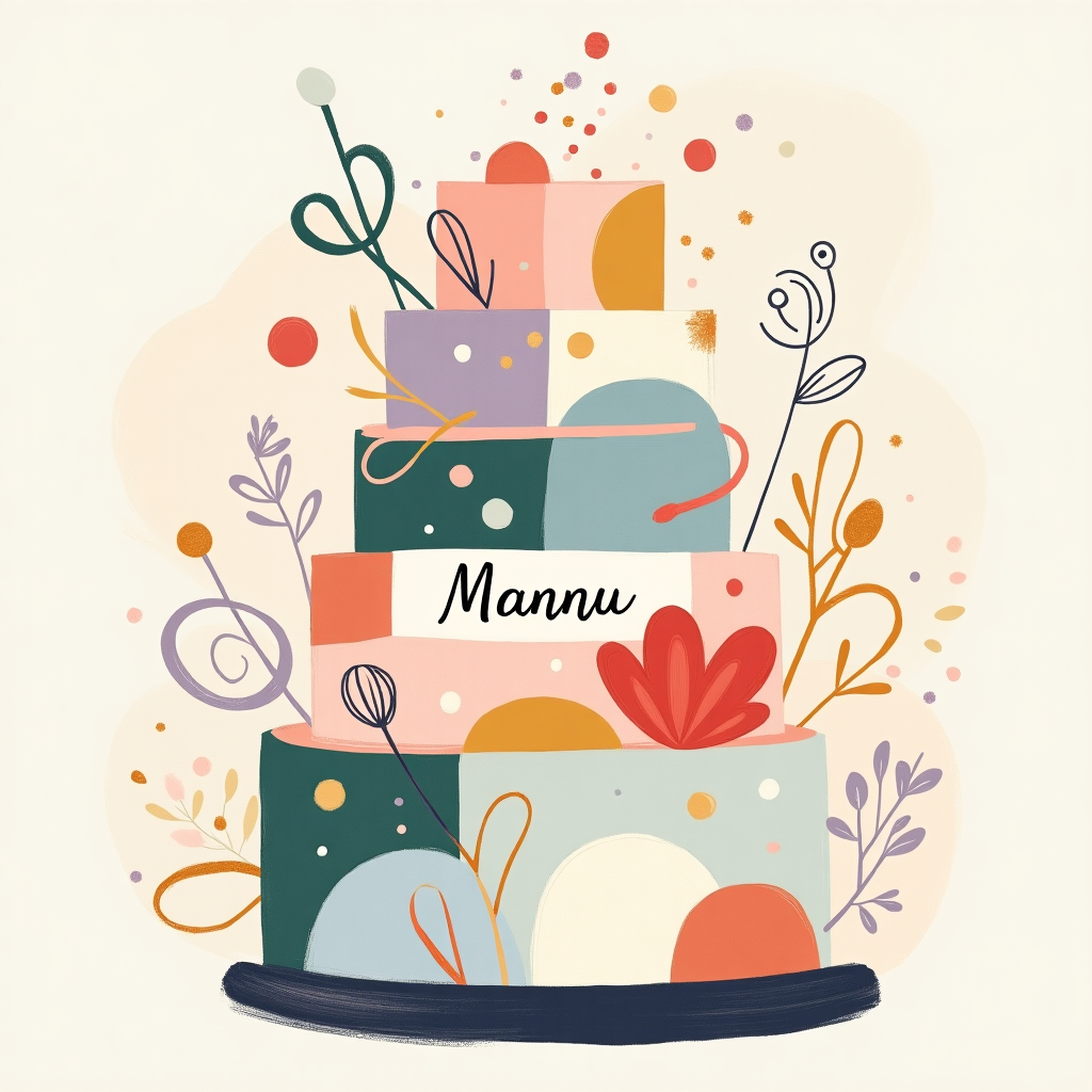 - The name “Mannu” is artfully integrated into the scene. Imagine a floating banner, echoing the curves of a Calder mobile, gently suspended above the cake. The banner is a soft pastel pink, with “Mannu” scripted in a slender, graceful silver typeface.