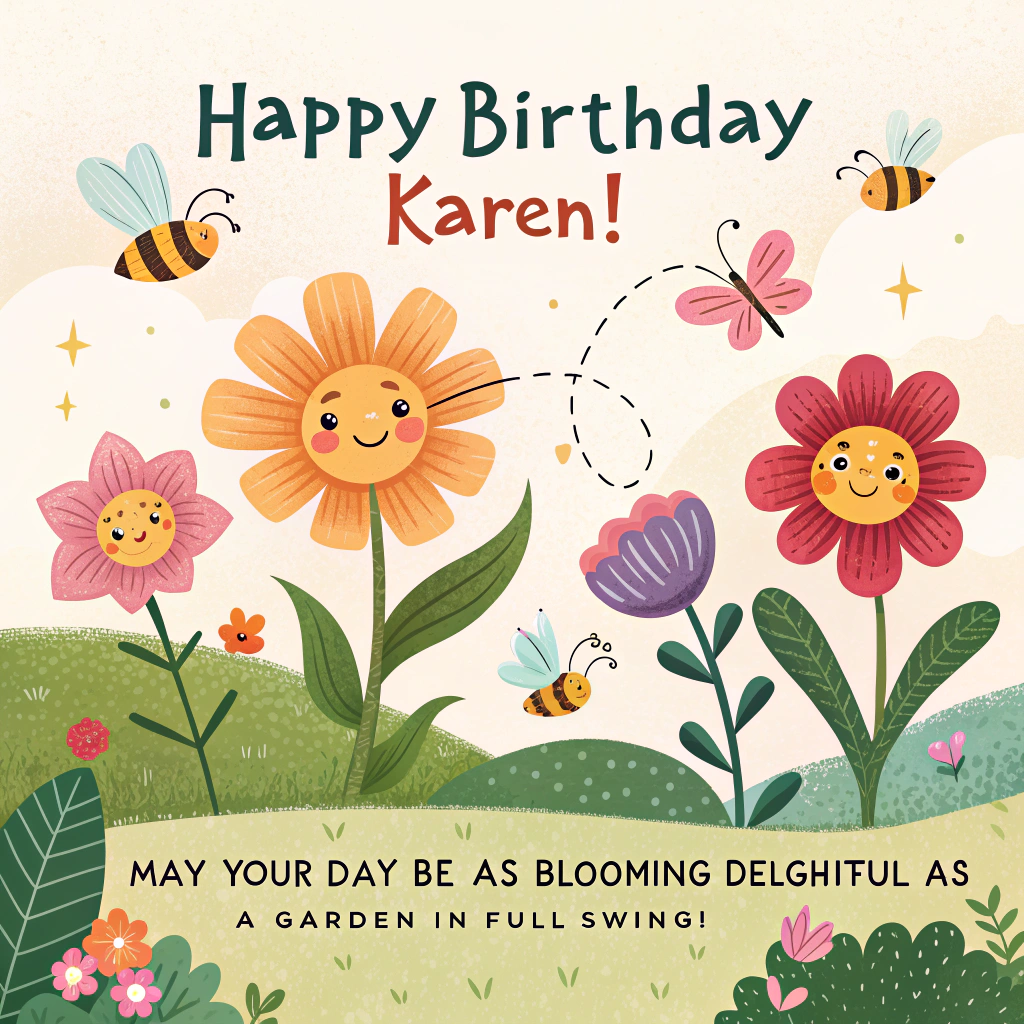 - In the center of the image, illustrate a whimsical garden bursting with an array of vibrant flowers, where each bloom has a playful face smiling towards the sun. Butterflies and bees dance around joyously, adding life and color to the cheerful scene.