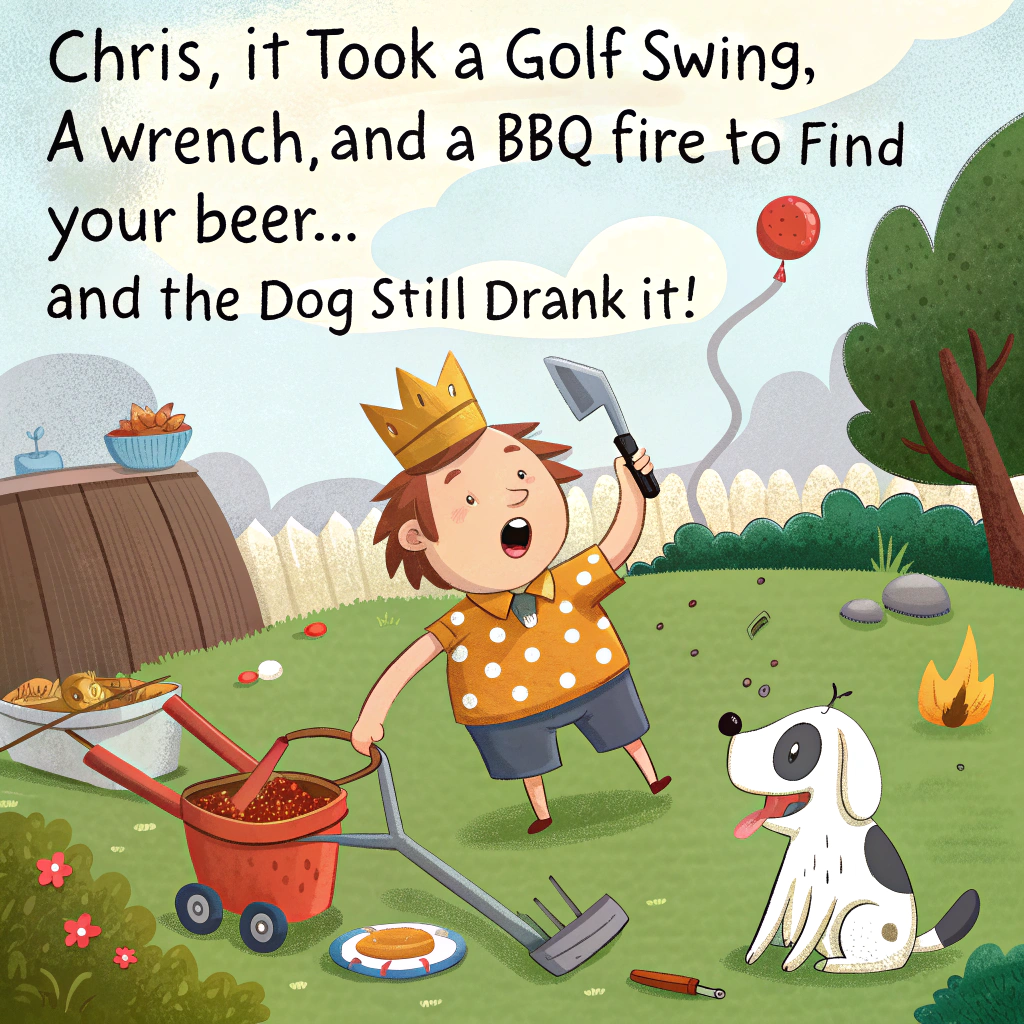 At the top of the image, "Chris, it took a golf swing, a wrench, and a BBQ fire to find your beer… and the dog still drank it!"