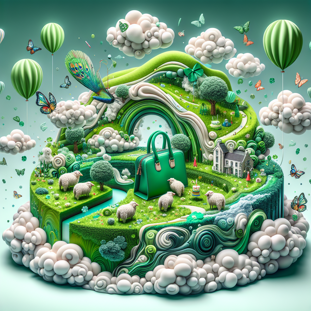 Craft an imaginative birthday illustration, where the lush green landscape of an abstract Irish countryside wraps surrealistically around an island-shaped cake. At the heart of the image sits a whimsically designed handbag, rendered with charming details like butterfly wings and peacock feathers. Floating semi-transparent balloons transform seamlessly into sheep, drifting among fluffy, cotton candy clouds. A trail of vivid green shamrocks guide the viewer to a suspended birthday banquet in the sky.