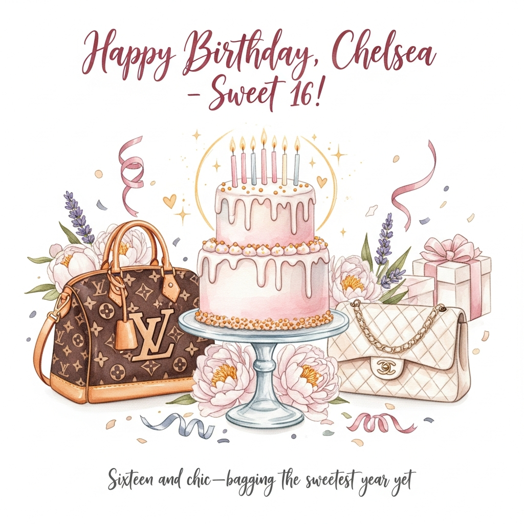 Sincere, airy watercolor scene with soft washes, delicate gradients, subtle pigment blooms, and natural cold‑press paper texture. Center stage: a pastel tiered celebration cake on a glass stand, frosting in blush and cream with gentle watery edges, dotted with warm-ochre “gold” sprinkles, and crowned by sixteen slender candles softly glowing. To the left, an elegant Louis Vuitton handbag in cocoa and caramel tones with the iconic monogram loosely suggested in soft, imperfect brushmarks. To the right, a classic Chanel quilted handbag in soft ivory with a whisper of a gold chain and the double‑C clasp, rendered with light, suggestive strokes—tasteful and painterly, never photorealistic. Around them: a few pale peony blossoms and ribbon curls, light confetti, and a pair of softly painted gift boxes, all fading into airy negative space for a refined, heartfelt feel. Palette: blush pinks, warm creams, champagne, lavender haze, soft cocoa, and muted charcoal. Gentle, warm lighting and a calm, sincere mood.