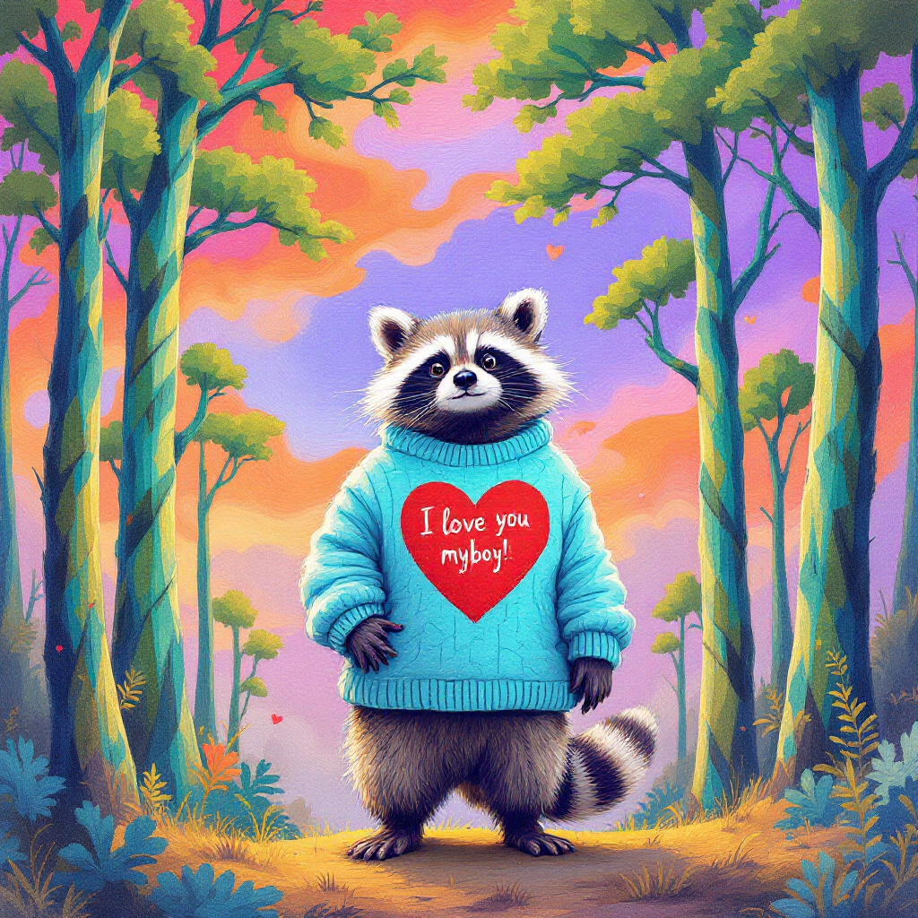 In the center of the card, a whimsical raccoon stands proudly, clad in a vibrant, oversized sweater that drapes over its furry body. The sweater is a soft pastel blue, adorned with a large, red heart emblazoned in the middle, intricately knitted to proclaim "I love you myboy!" in a playful script. The raccoon's eyes are wide with joy, and its tail curls elegantly around its feet, subtly suggesting a heart shape at its tip. Surrounding the raccoon, an enchanting forest scene unfolds with a touch of surrealism. The trees are tall and slender, with trunks that twist into geometric patterns reminiscent of Orlando Arocena's abstract style. Their leaves are exaggerated and kaleidoscopic, blending vibrant hues of green, teal, and hints of gold, catching the sunlight that filters through.