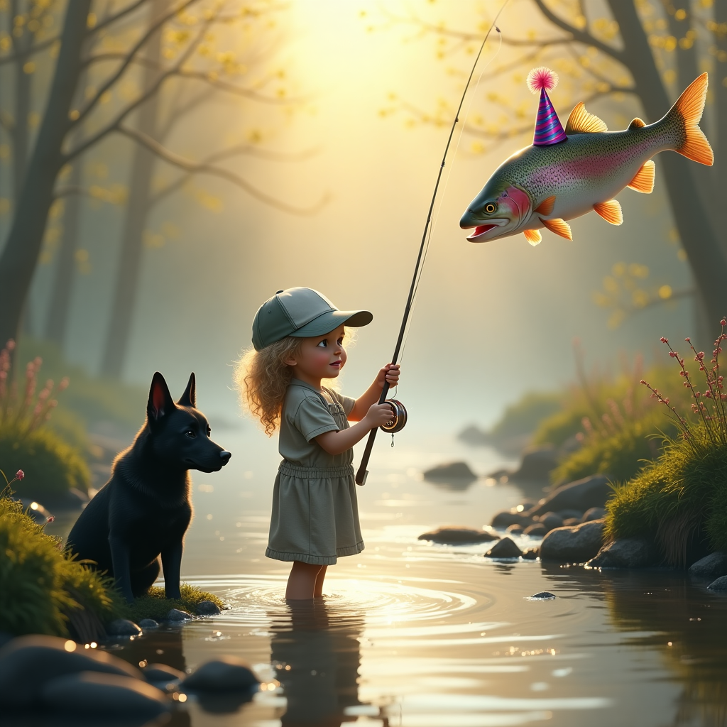 A surreal, dreamlike birthday morning scene set in a softly lit forest stream. In the center, a confident 6-year-old girl with wispy blonde hair peeks out from under a slightly oversized grey trucker cap. She stands ankle-deep in the stream, proudly fly-fishing with practiced ease. The early morning sunlight gently filters through budding spring trees, casting silvery light over the rippling water. Nearby on the mossy riverbank, a black shepherd-lab mix with alert, pointy ears sits attentively, wearing a brightly colored festive party hat. In the shimmering air above the water, a jubilant trout leaps skyward — also sporting a tiny party hat — its scales catching the surreal golden-pink glow of the morning. The whole scene has a magical stillness, with mist swirling around the characters, as if time paused for this joyful, impossible moment.