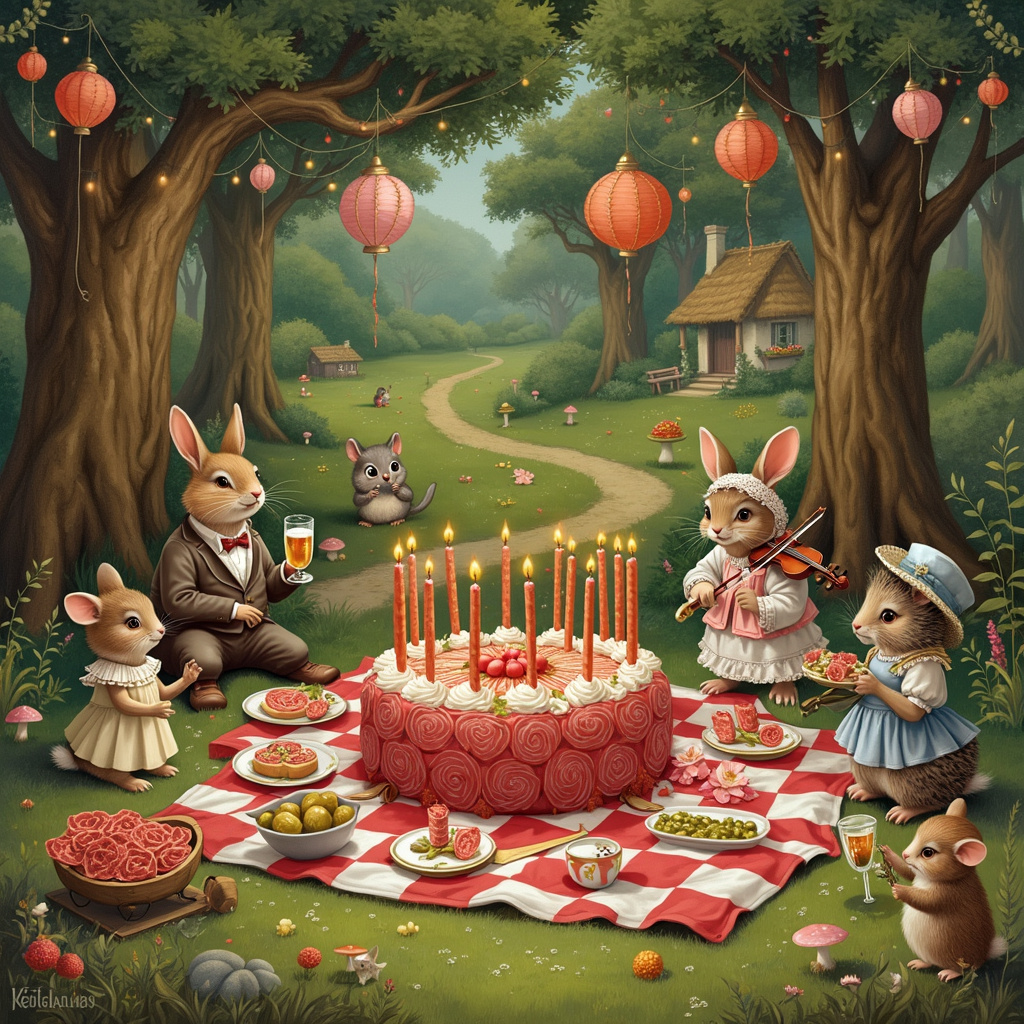 In the scene, a jubilant birthday picnic unfolds in a lush, enchanted forest glade. The centerpiece is a whimsical, oversized picnic blanket adorned with an elaborate checkerboard pattern in vibrant reds and whites, laid out on a meadow sprinkled with delicate wildflowers. At the heart of this festive spread, there is an enormous, elaborately decorated birthday cake, crowned with a cascade of candles in the shape of salami slices.
