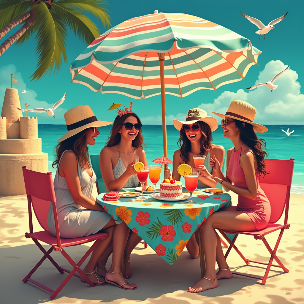 The whole scene is bustling with detail and vibrant colors, capturing the joyous essence of Tasha's beachside birthday bash with her best girlfriends and their delightful cocktails.