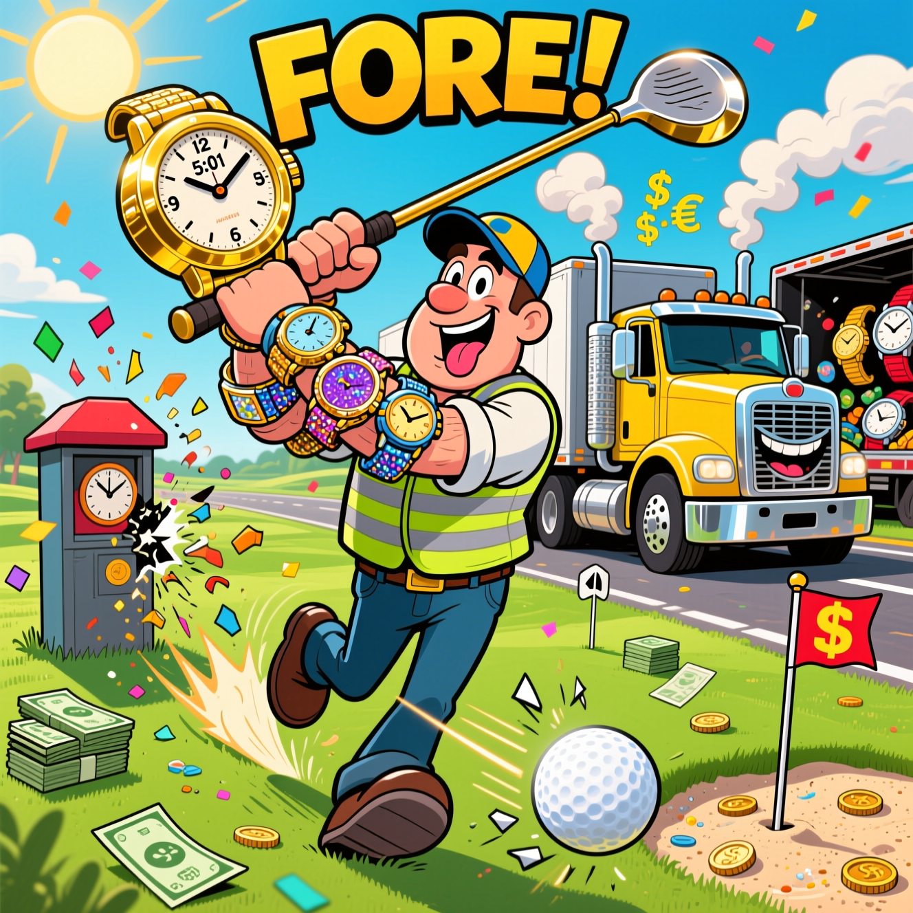 A loud, playful Cartoon Style scene on a bright, sun-blasted golf fairway that morphs into a highway: an oversized, cheeky lorry driver in a hi-vis vest and trucker cap is mid-swing with a gigantic gold driver whose clubhead is a chunky watch face set to 5:01 (clock-off time). His forearms are stacked with multiple glittering wristwatches, each face popping with exaggerated highlights. The dimpled golf ball has a metallic sheen and a faint $ stamp, streaking off with wild motion lines, tearing through a busted punch-clock kiosk on the edge of the green—shards and timecards explode into the air like confetti. Behind him, his cartoon 18-wheeler (grinning chrome grill, exhausts puffing $£€-shaped smoke) is parked on the fairway like a smug golf cart; its open trailer spills oversized wristwatches and a few coins that sparkle in the sun. The tee markers are little stacks of bills, a sand trap glitters with coins, and the flag on the green is a bold dollar sign. The driver’s pose is exuberant and a bit rude: cocked eyebrow, tongue peeking, hip thrust into the follow-through, radiating “I don’t give a truck” energy. Use thick black outlines, super-saturated colors (vivid greens, hot yellows, punchy reds, shiny chrome), bouncy proportions, and whip-fast motion arcs for a kinetic, comedic hit.