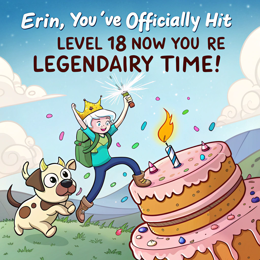 - In the center of the image, depict an Adventure Time-style scene where Erin is riding a giant flying birthday cake like it’s a dragon through a surreal candy-colored sky. She's dressed like Finn, but with 18 candles blazing on her head like a flaming crown.