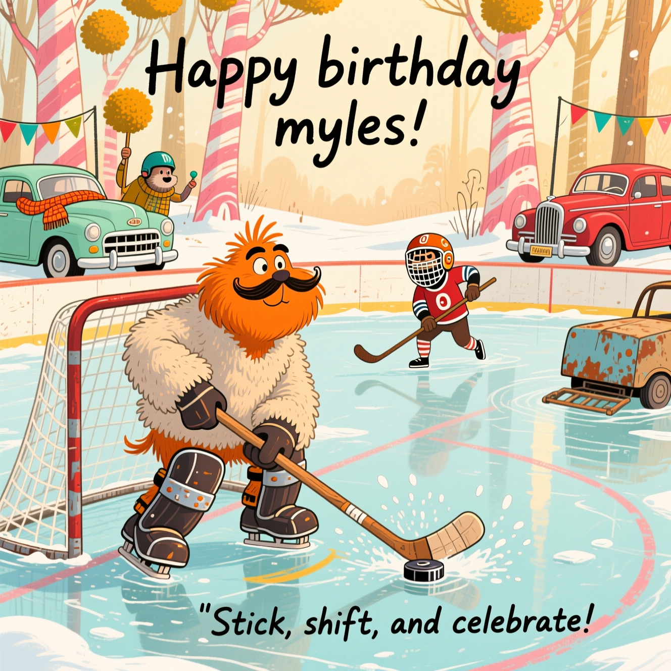 Hand-drawn illustration with fine linework, textured brush strokes, balanced composition, and a warm, expressive color palette. Funny, whimsical mood. Scene: On a frozen pond beneath swaying Truffula trees (candy-striped trunks, pom-pom tops), the Lorax—small, orange, and gloriously mustachioed—guards a wobbly goal cobbled from old chrome grilles and bumpers. He’s bundled in comically oversized, fluffy Truffula-tuft goalie pads and grips a wooden stick, bracing as a shiny hubcap puck skitters toward him, spraying tiny ice shavings. Two fuzzy forest critters in helmets and jerseys hustle in with curved sticks, mid-slapshot. Rink-side, charming old cars cheer like fans: a mint-green ’50s sedan with a knitted scarf and pennant, a cherry-red ’30s coupe wearing a vintage goalie mask on its grille; another battered classic putters by as a homemade Zamboni, leaving a glossy track. Soft golden afternoon light, warm oranges, mustard yellows, coral pinks, teals and mints; gentle paper grain, playful cross-hatching, painterly gouache strokes. Clear focal point on the Lorax in goal, lively motion lines, cozy winter breath puffs, no brand logos.
