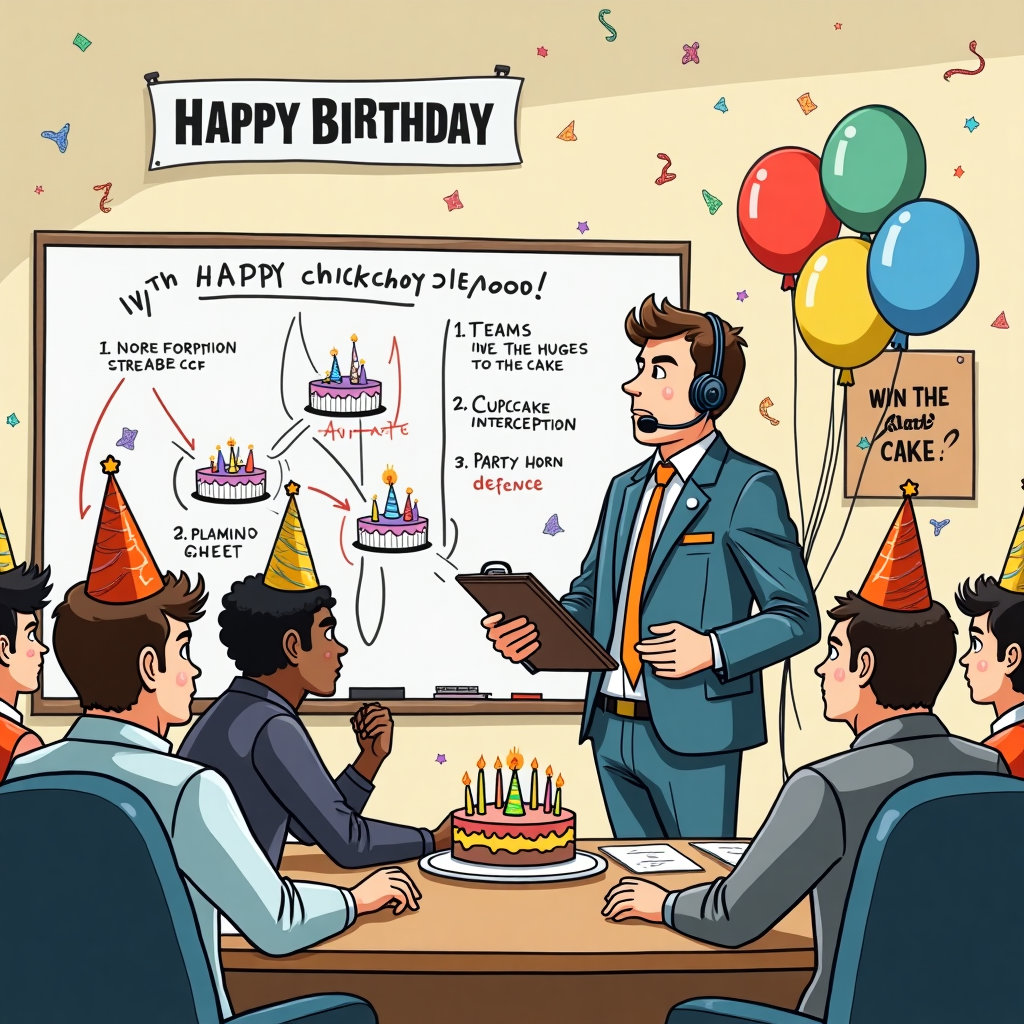 An illustrated office scene where Ethan, dressed as a dramatic football coach with a headset and clipboard, is giving an intense birthday "pep talk" to a confused-looking team of employees wearing party hats and holding balloons. Behind Ethan is a whiteboard with an overly complicated "birthday playbook" featuring routes to the cake, party horn defense strategy, and a cupcake interception drill. One teammate fumbles a giant cupcake while another is doing jumping jacks with streamers. Confetti flies through the air like victory sparkles. A motivational poster on the wall reads: “Win the Day (and the Cake).”