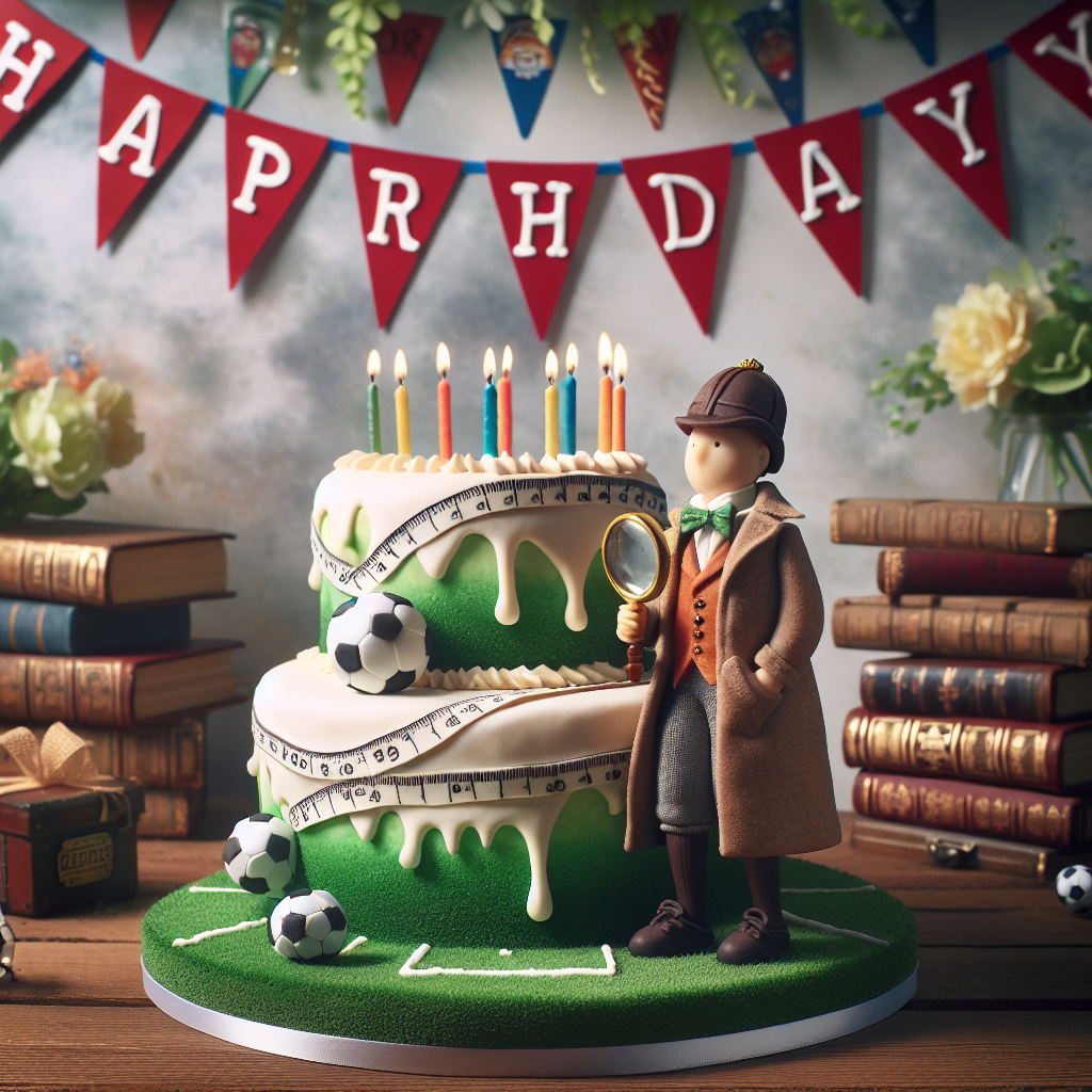 Create an enchanting birthday scene filled with joy. The backdrop of the scene is draped with a lively football-themed banner, symbolizing a festive spirit. At the center, there is a whimsical cake standing tall, decorated with icing dribbles that look like timelines, representing a trip through history. Sitting on top of the cake is a figurine of a famous detective, reminiscent of characters from period British novels, holding a magnifying glass as if unfolding the mystery of another year passing.