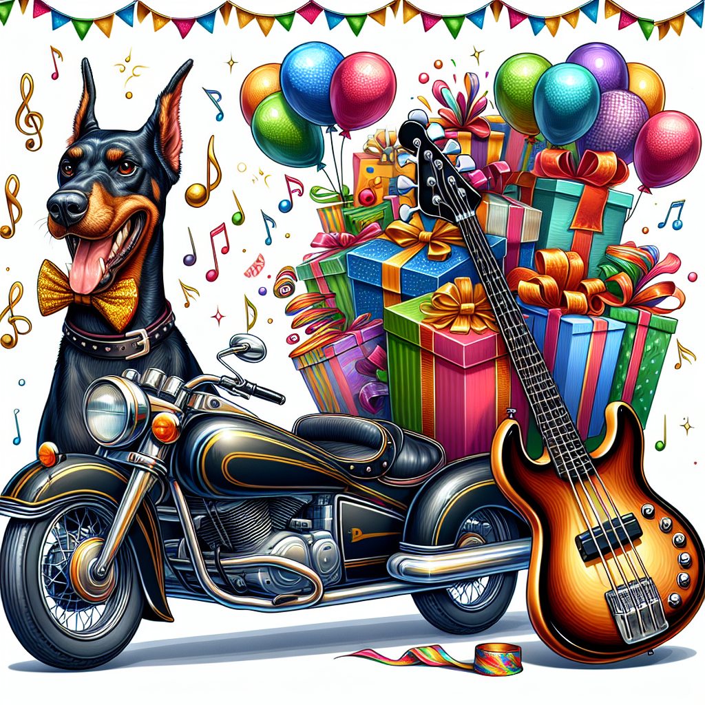 Create a colorful, whimsical birthday scene. At the center of the illustration, depict a grinning Doberman in a snazzy bow tie perched confidently atop a classic motorcycle. The motorcycle's sidecar is packed full, overflowing with an exuberant display of birthday gifts and vibrant balloons. In the foreground, there is a sleek bass guitar wrapped neatly in a festive ribbon, being presented as a gift. Musical notes are playfully fluttering around the guitar, symbolizing the melody of a lively birthday song. The entire scene is embellished further by a festive garland of streamers and by twinkling fairy lights, adding an element of lively celebration.