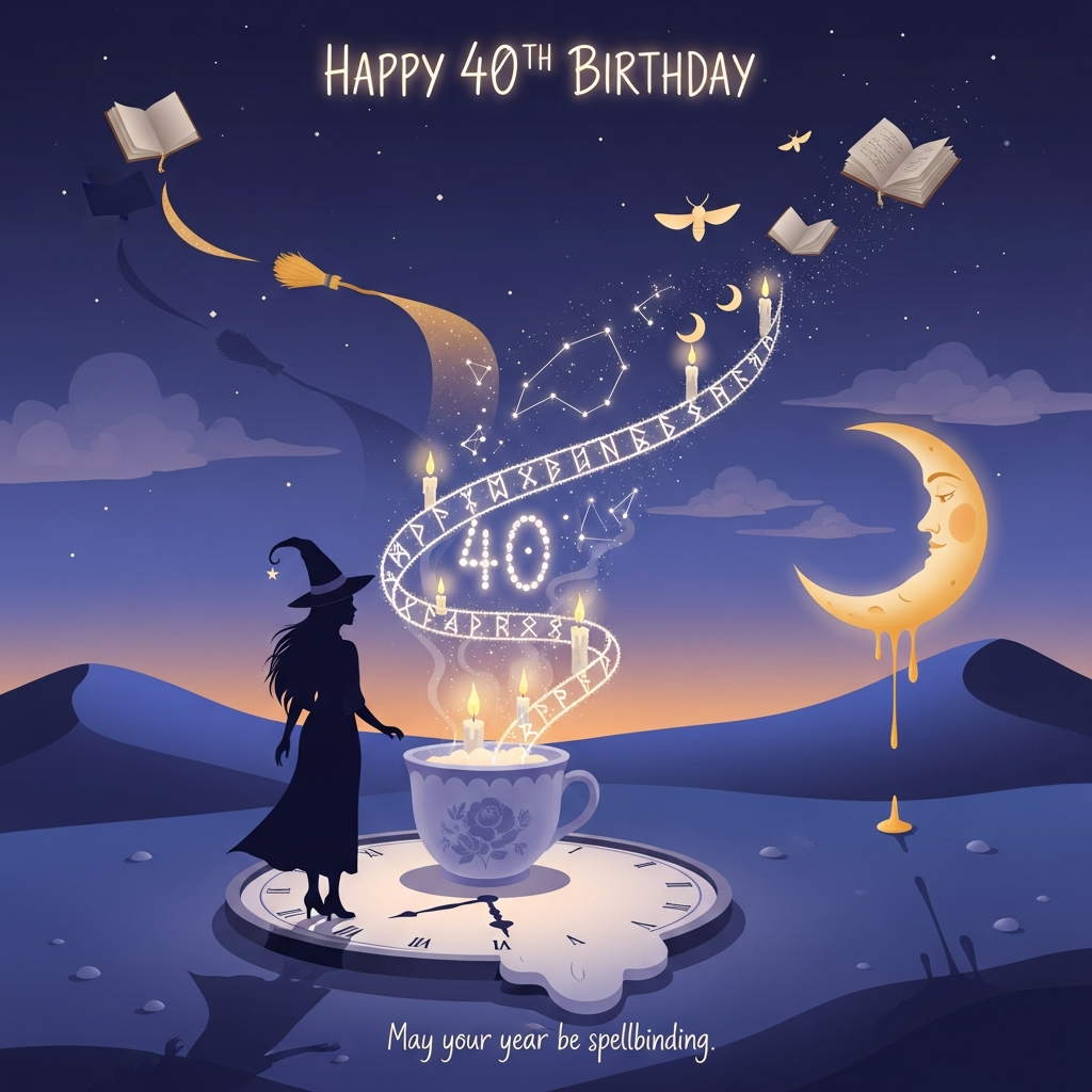 Dreamlike surrealism, Dali-inspired, melting shapes and ethereal lighting in an otherworldly nightscape. A benevolent witch—graceful silhouette with a crescent-moon hat—stands beside a porcelain cauldron shaped like a teacup, perched on a softly melting moonlit clock. From the cauldron, a luminous ribbon of stardust and gentle runes spirals upward, forming a glowing spell circle; within the smoke, constellations briefly shape the number 40 before drifting into tiny candle-flames with crescent-moon tips. Indigo and lavender dunes; a ribbon-like crescent moon drips warm gold; an open grimoire’s pages lift off as light-moths; a broom bends into a golden path across the sky. Warm moon-gold highlights, amethyst shadows, elongated dream-shadows; tranquil, sincere, quietly celebratory mood of blessing and new beginnings. The top text is hand-lettered in soft moon-gold with a subtle glow, minimal and elegant. Small caption near the bottom, delicate and understated: May your year be spellbinding.