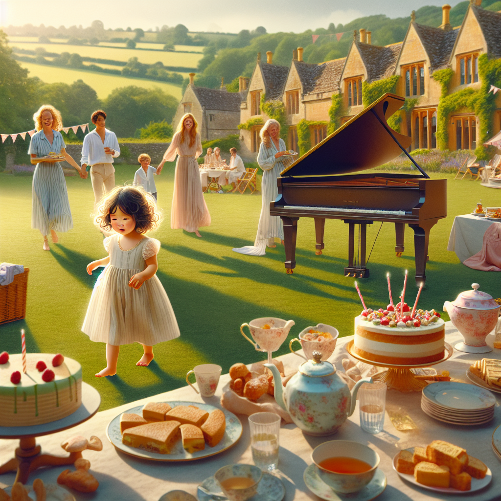 Create a charming outdoor summer scene in the Cotswolds. Focus on a birthday celebration with a 'Cute Realistic' theme taking place on a sun-drenched green field. Include a grand piano as the centerpiece, its lavish tones echoing amidst the laughter of the attendees. Add an East Asian toddler with bouncy light curls wandering around, contributing to the celebration's delight. Nearby, depict a spread of delicious food, fragrant tea, and luxurious cakes enticing the guests. Have a South Asian female teacher softly guiding the child, engineering a birthday memory as sweet as the cakes present. The heartwarming event, underlined by the idyllic splendor of the Cotswolds, should radiate an impression of a captivating storybook.