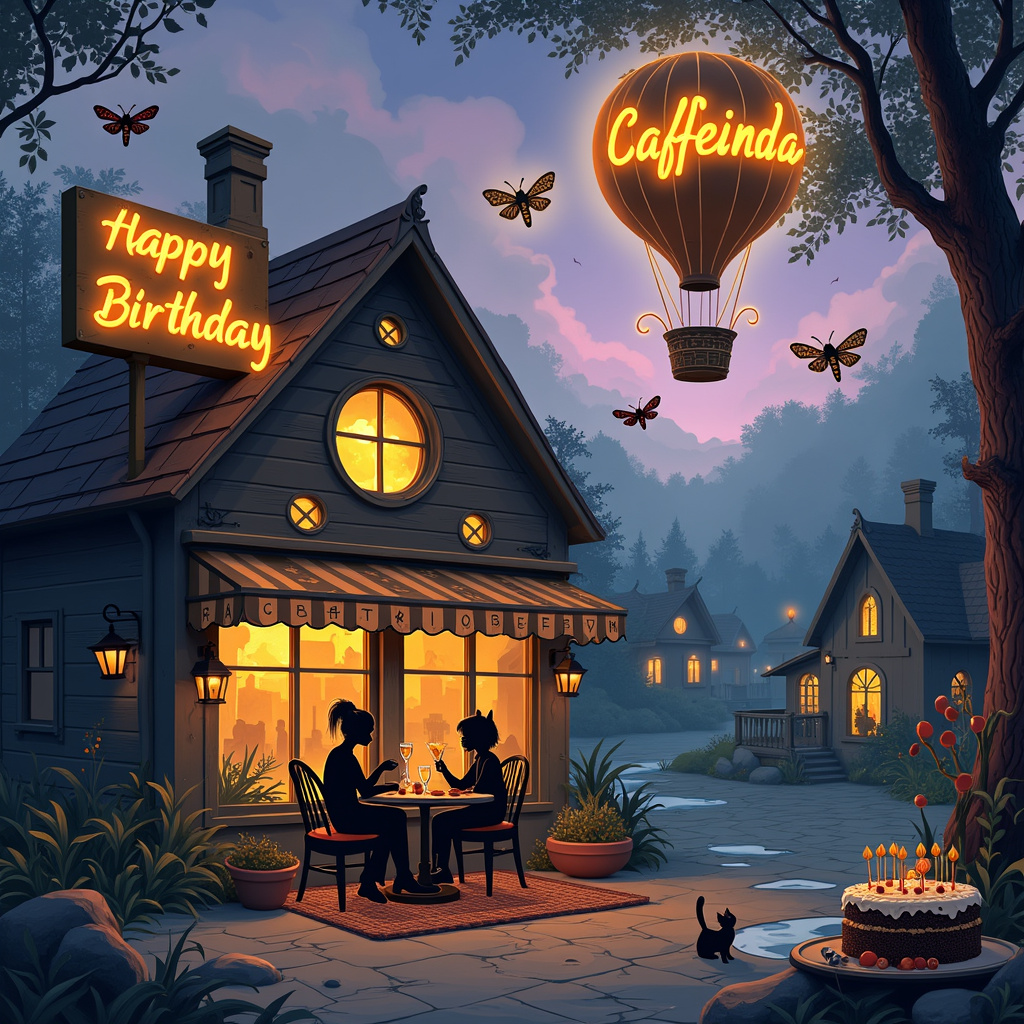 Hovering above the café in the sky, a group of whimsical, cartoonish death moths spell out "Happy Birthday Leanda" with their glowing wings, making the name Leanda sparkle in golden hues. Next to this, there is a coffee cup-shaped hot air balloon with steam that curls into the shapes of various Friday the 13th symbols, like black cats, broken mirrors, and ladders. The café sign reads “Caffeine & Cocktails” with a retro neon vibe reminiscent of an old-school diner sign.