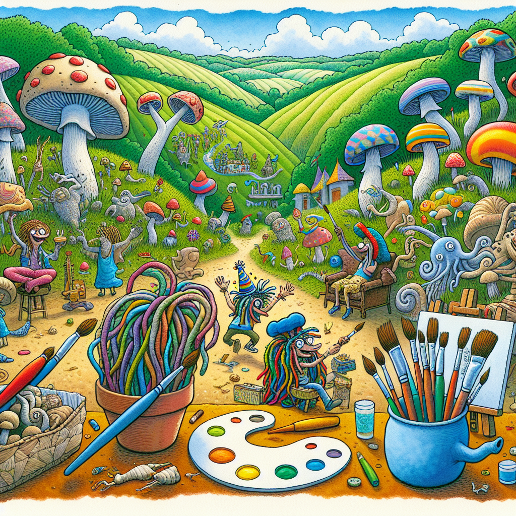 Imagine a scene of a handcrafts workshop nestled within the undulating landscapes of the lush countryside. The distinct, rich scent of mushrooms subtly intertwines with the fresh aroma of grass. Illustrate cartoon characters, each sporting unique dreadlocks that barely squeeze under funky, blues-inspired hats, engrossed in creating sculptures from sea shells for a surrealistic birthday party. Visualize paintbrushes rhythmically stroking canvases, spreading bold, bright colors to further enliven this artistic wonderland. Include playful sea creatures having a rollicking time, each adorned with a festive party hat, immersing themselves in the jubilant celebrations.