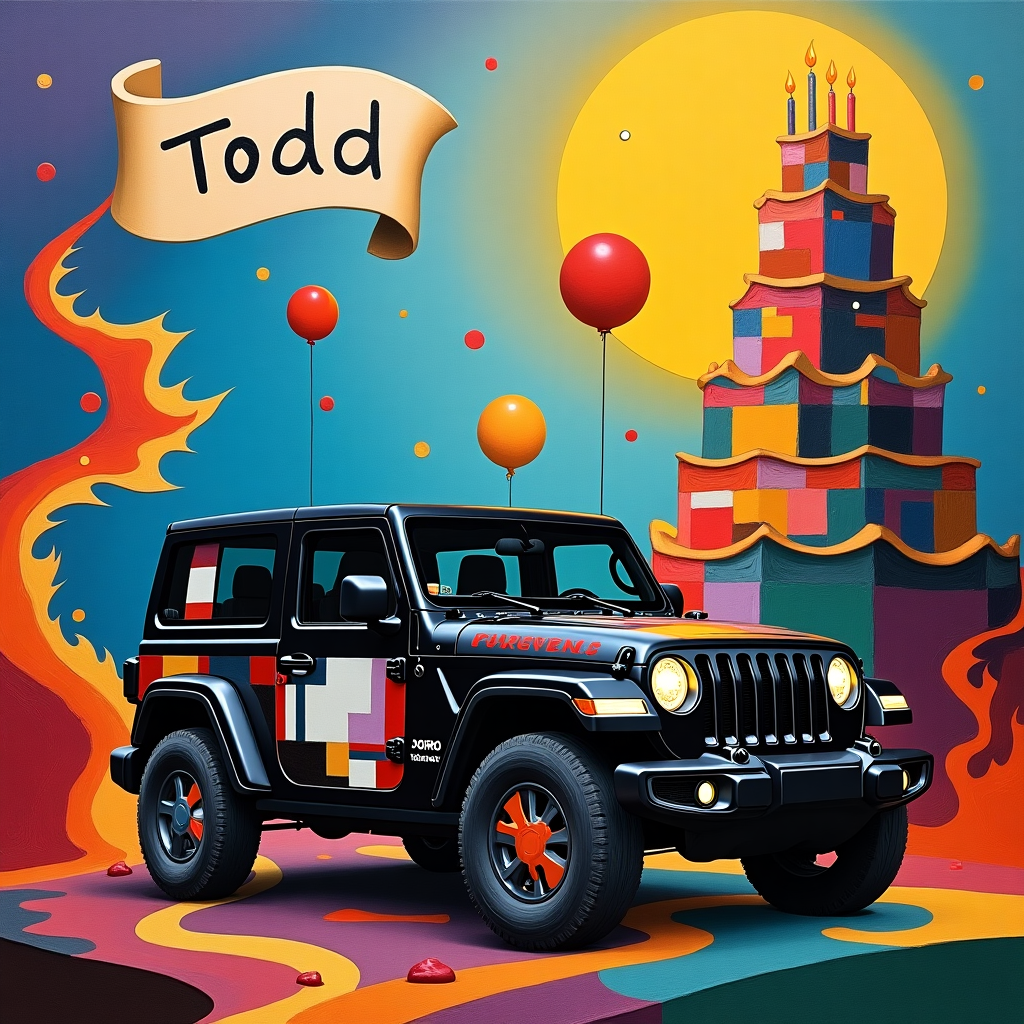 The scene unfolds as a surreal and abstract visual feast, incorporating vibrant shapes, colors, and forms to encapsulate a birthday theme with a Black Jeep Wrangler at the heart of the composition.