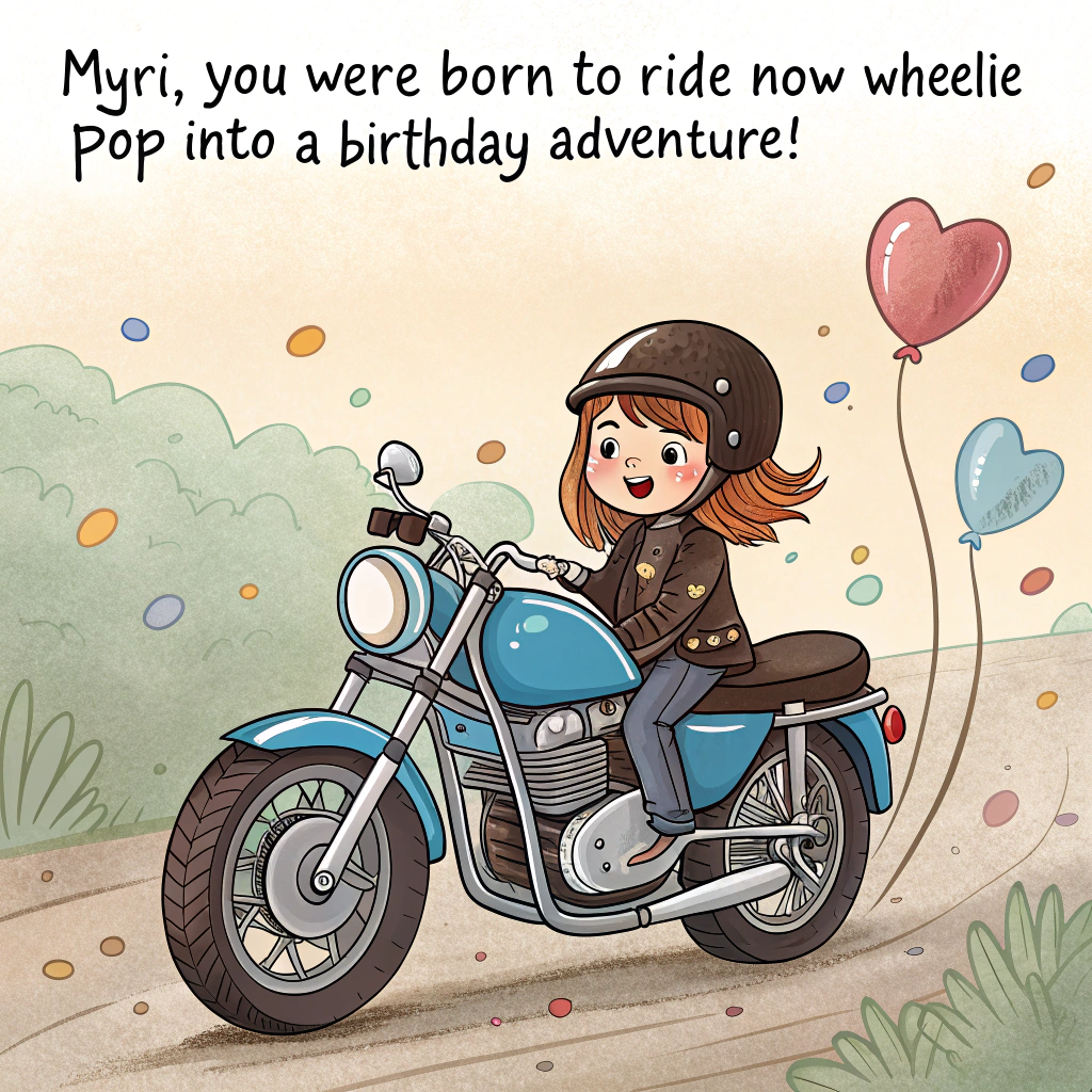 At the top of the image, "Myri, you were born to ride – now wheelie pop into a birthday adventure!"