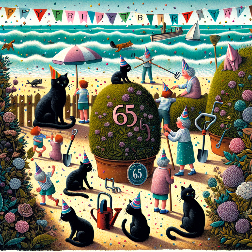 Generate an image of a whimsical, cartoon-style birthday invitation. It celebrates a 65th birthday set on a quaint, seaside backdrop. Sly black cats, wearing party hats, play in the background, while the forefront positions a sunlit garden. In this garden, cartoon children of diverse genders and descents are engaged in a game of hide and seek within bushes which are painted in hues of dark brown, akin to chocolate. The gardening tools, delightfully oversized, serve as subtle hints at a deep-rooted love for gardening. Embodying the spirit of the festival, the ocean waves are brought to life with splashes of multi-colored confetti.