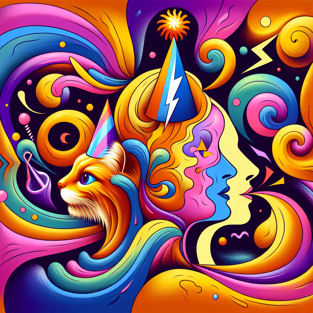 Imagine a kaleidoscopic birthday dimension in which time and space are deformable. Replace the iconic individual with a silhouette characterized by a distinguished lightning bolt on the face, combining this image with a playful orange-haired cat donned in a party hat. Abstract forms and curls of bright hues envelop them, encapsulating the distinctiveness of an uncanny festivity.