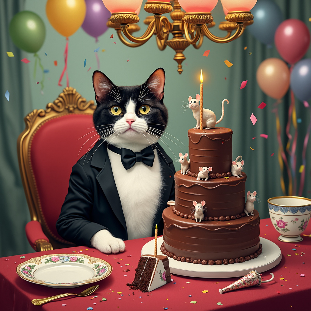 In the center of the card, a tuxedo cat named Sir Whiskers is seated majestically at the head of an elegant dining table. His shiny black and white fur is perfectly groomed, contrasting against the opulent deep red velvet tablecloth. Sir Whiskers wears a tiny bow tie that mirrors his tuxedo pattern, adding to his debonair charm. The table is lavishly set with mismatched vintage china plates, each adorned with intricate floral patterns in faded blues and pinks. In front of Sir Whiskers, an enormous three-tiered birthday cake towers, its layers swathed in velvety smooth chocolate frosting. The cake is whimsically decorated with pastel-colored fondant mice, which seem to be playfully scampering up its sides, heading towards the crowning glory—a miniature sugar-crafted cat holding a golden candle. Strewn about the table are party hats in various sizes and colors, one perched jauntily on Sir Whiskers' head, slightly askew. In the background, a cluster of vibrant balloons floats at various heights, their glossy surfaces reflecting the warm glow of the chandelier overhead. Near the cake, a small plate with a slice cut out reveals a rich, moist interior speckled with chocolate chips—proof of Sir Whiskers' indulgence. Sprinkled confetti and colorful streamers drape casually across the table, adding an air of festivity to this sumptuous scene, while a half-unfurled party blower lies beside Sir Whiskers, suggesting he’s ready to celebrate his favorite pastime: cake devouring.