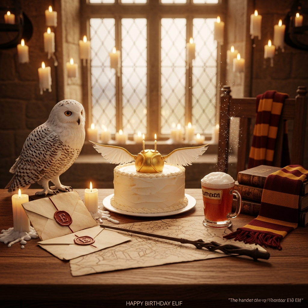 Ultra-high-definition 4K UHD photograph in a sincere, warm mood: a cozy, wizarding-world birthday scene inside a grand, candlelit stone hall reminiscent of Hogwarts. Foreground focus on a rustic oak table by a tall mullioned window with late-afternoon golden light streaming in. Centered on the table sits a round buttercream cake styled as a golden snitch—smooth white frosting, subtle edible-gold sheen, delicate sugar wings—one small candle softly flickering. Beside it: an aged parchment envelope sealed with deep red wax embossed with an ornate E, a polished wooden wand resting across map-like parchment, a frothy butterbeer in a glass mug, a tidy stack of worn leather spellbooks, and a striped scarf in deep scarlet and gold draped casually. A snowy owl perches on a chair back, feathers detailed and lifelike, watching the scene. In the background, dozens of floating candles glow, their flames forming gentle bokeh; tiny motes of dust and faint sparkles arc from the wand tip as if a recent charm was cast. Textures are tactile and real: wood grain, wax drips, parchment fibers, frosting swirls, soft plumage. Color palette: warm ambers, honey browns, cream, candle-gold, with hints of burgundy and forest green. Camera: full-frame DSLR, 50mm prime, f/1.8, ISO 200, 1/200s; cinematic shallow depth of field with the cake, letter, and wand crisply in focus, background softly blurred; accurate mixed lighting from diffuse window light and warm candlelight.